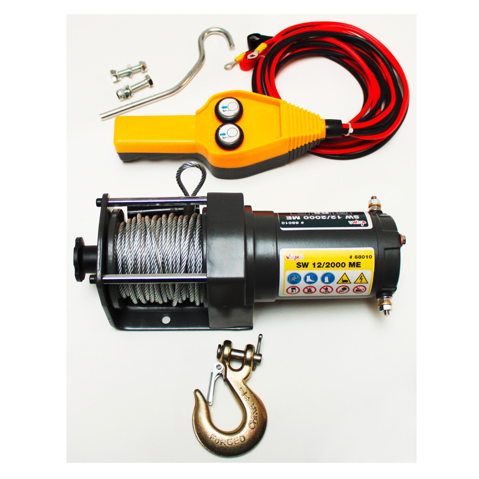 Лебедка DEMA 68010 – ATV EW 2000 H, ви помага отново да издърпате количката от мръсотията. Идеален за всички видове ATV, куадове (квадроциклети), тревни трактори, държачи и др. Лебедката DEMA ATV EW 2000 H се характеризира с лесен монтаж и надеждна функционалност. Безопасността и отличното съотношение цена-качество винаги са на преден план. DEMA ATV – кабелна лебедка EW 2000 H – важен помощник при спешни случаи.