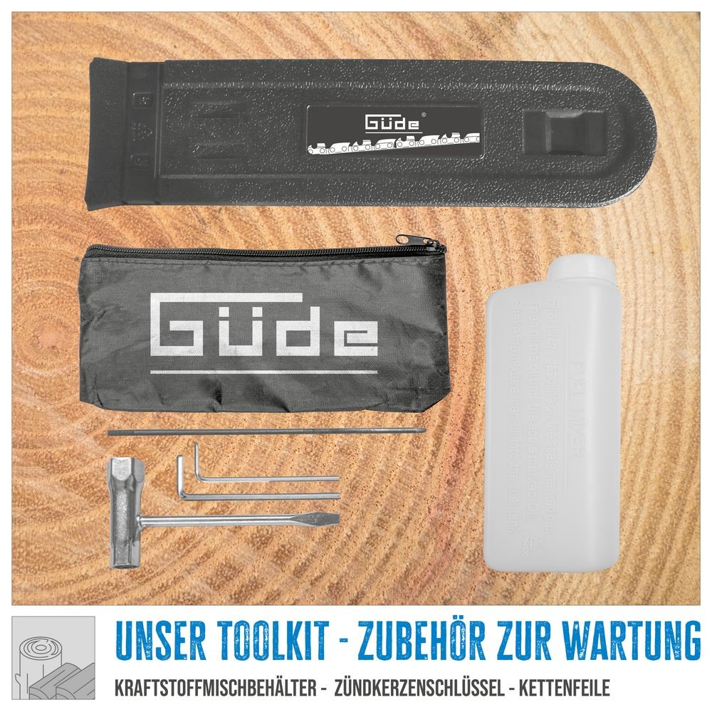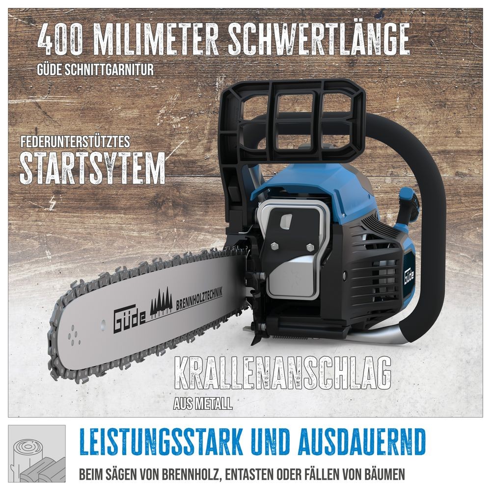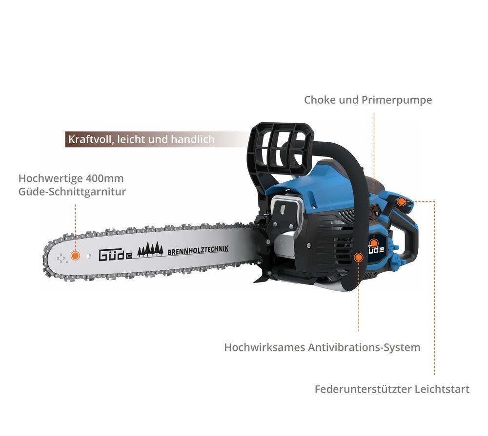Бензиновата резачка Güde KS 400-38 е надеждно и ефективно решение за поддръжка на дървесина около дома и за по-леки дейности по рязане на дърва за огрев. Оборудвана е с мощен 2-тактов двигател с работен обем 38 cm³ и мощност 1.4 kW (1.9 к.с.), който осигурява висока производителност и стабилна работа.Моделът разполага с пружинно подпомогната система за лесен старт, подкачваща помпа и смукач за бързо запалване. Антивибрационната система значително намалява умората при продължителна работа, а металният опорен зъб и лагеруваният от двете страни колянов вал гарантират стабилност и дълъг експлоатационен живот.Комплектът включва съд за смесване на гориво, предпазител за шината и веригата, както и комплект инструменти с удобна чанта.