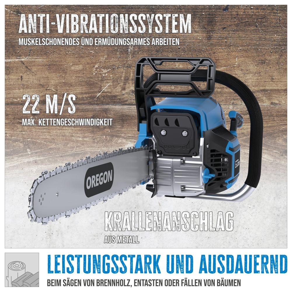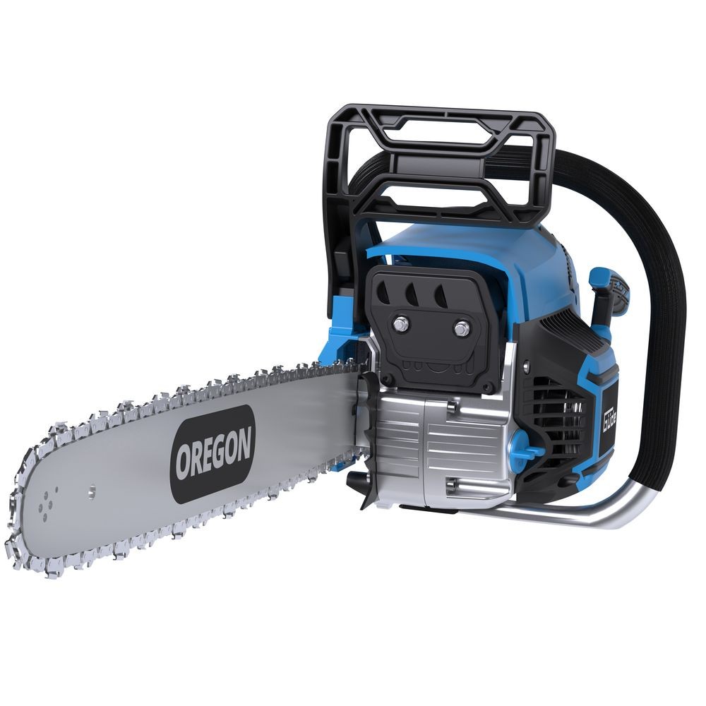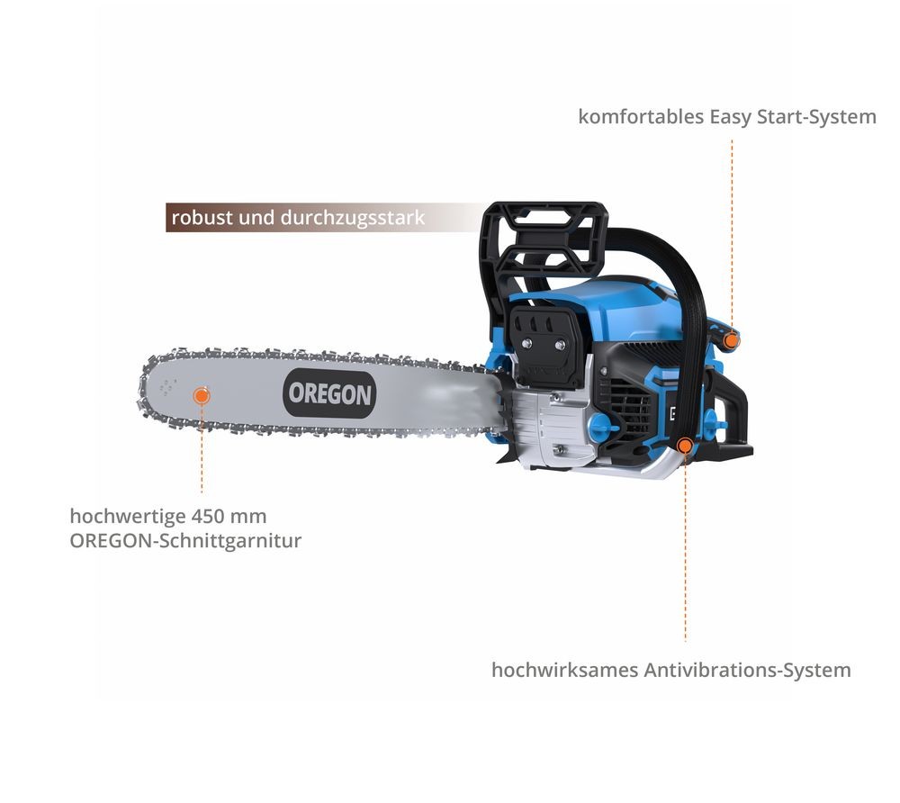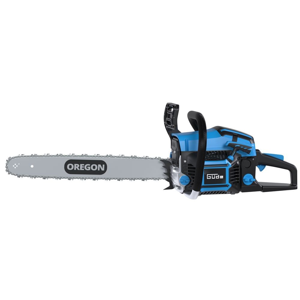 Бензиновият верижен трион Güde KS 450-55 е универсален и мощен модел, предназначен за обработка на дърва за огрев, поддръжка на дървесина около дома. Оборудвана е с 55 cm³ двутактов двигател с мощност 2.3 kW (3.1 к.с.), който осигурява висока производителност при леки и средно тежки задачи. Моделът разполага с висококачествен режещ комплект Oregon (шина и верига 450 мм), което гарантира прецизно и надеждно рязане. Пружинно подпомогнатият старт, подкачващата помпа и смукачът позволяват бързо и лесно стартиране. Ефективната антивибрационна система намалява умората при продължителна работа, а лагеруваният от двете страни колянов вал и металният опорен зъб осигуряват стабилност и дълъг експлоатационен живот. Моделът отговаря на изискванията на EURO-V и е GS-сертифициран съгласно строгите стандарти за безопасност.