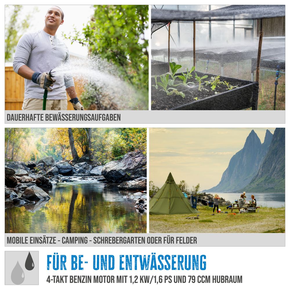 Приложение: За изпомпване на чиста до леко замърсена вода. Идеално решение за използване без захранване – например за аварийно отводняване, за използване на полета, строителни площадки или напояване в градината.