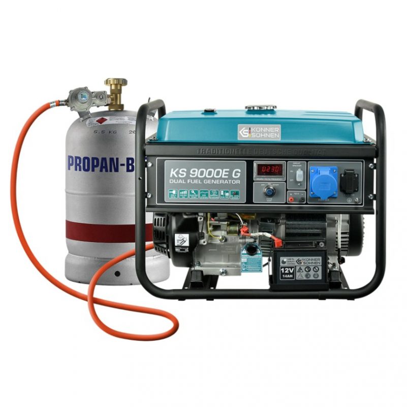 Всички необходими аксесоари за свързване на газова бутилка, са налични: генераторът разполага с маркуч и два редуцира за налягането на газта. Генераторът НЕ Е подходящ за свързване към газопровод. При необходимост можете лесно да превключите горивото. Задвижването се осъществява от едноцилиндров, четиритактов двигател с въздушно охлаждане.