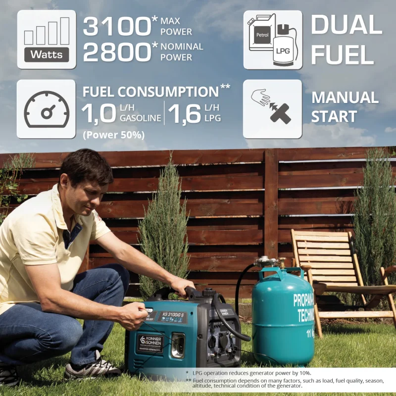 Всички необходими аксесоари за свързване на газова бутилка, са налични: генераторът разполага с маркуч и два редуцира за налягането на газта. Генераторът НЕ Е подходящ за свързване към газопровод. При необходимост можете лесно да превключите горивото. Задвижването се осъществява от едноцилиндров, четиритактов двигател с въздушно охлаждане.