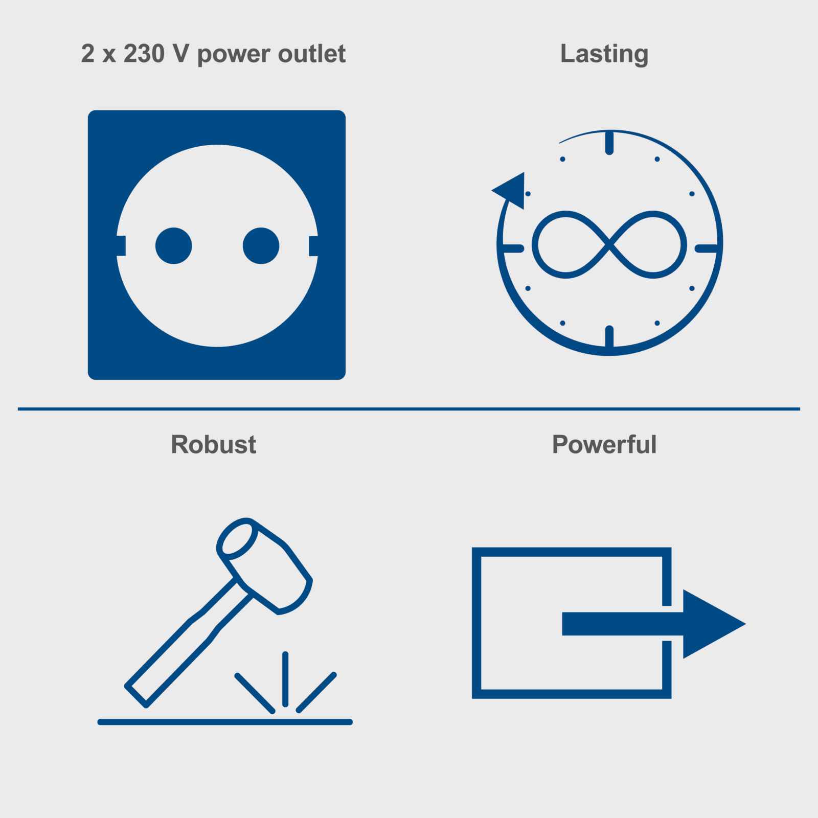 Екипиран с два 230 V контакта (16 A), които са защитени от претоварване и гарантират съвместимост с различни уреди.
