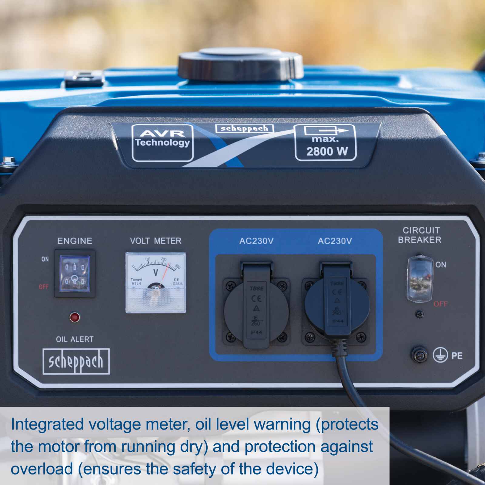 Разполага с индикатор за нивото на маслото, вграден волтметър и превключвател за защита от претоварване, които осигуряват безопасна и дълготрайна работа на устройството.