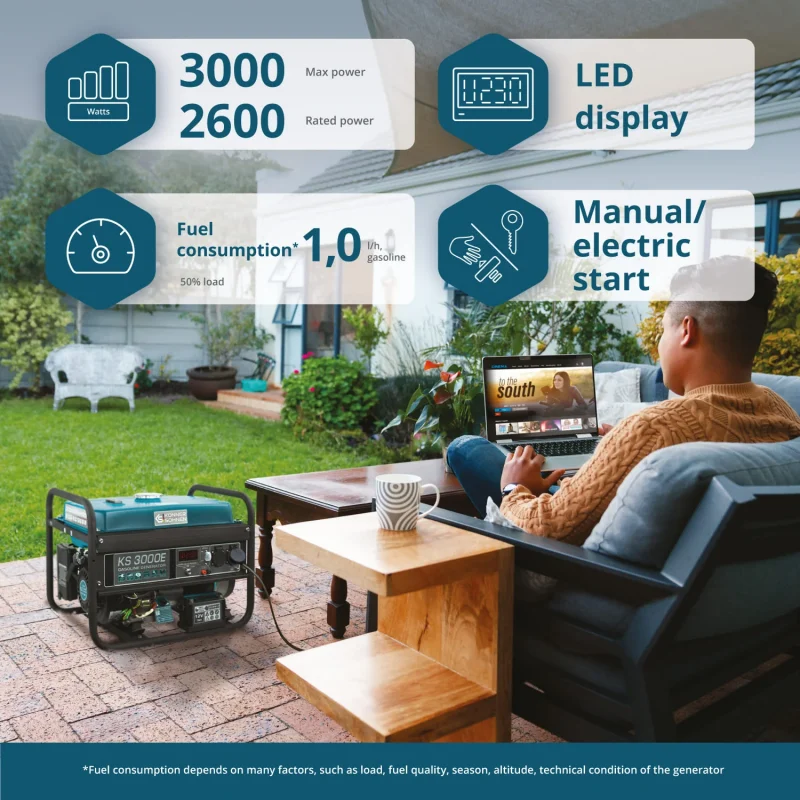 Захранван от 12.2 к.с. 4-тактов двигател с обем 420 см³, генераторът осигурява стабилна работа дори при голямо натоварване.