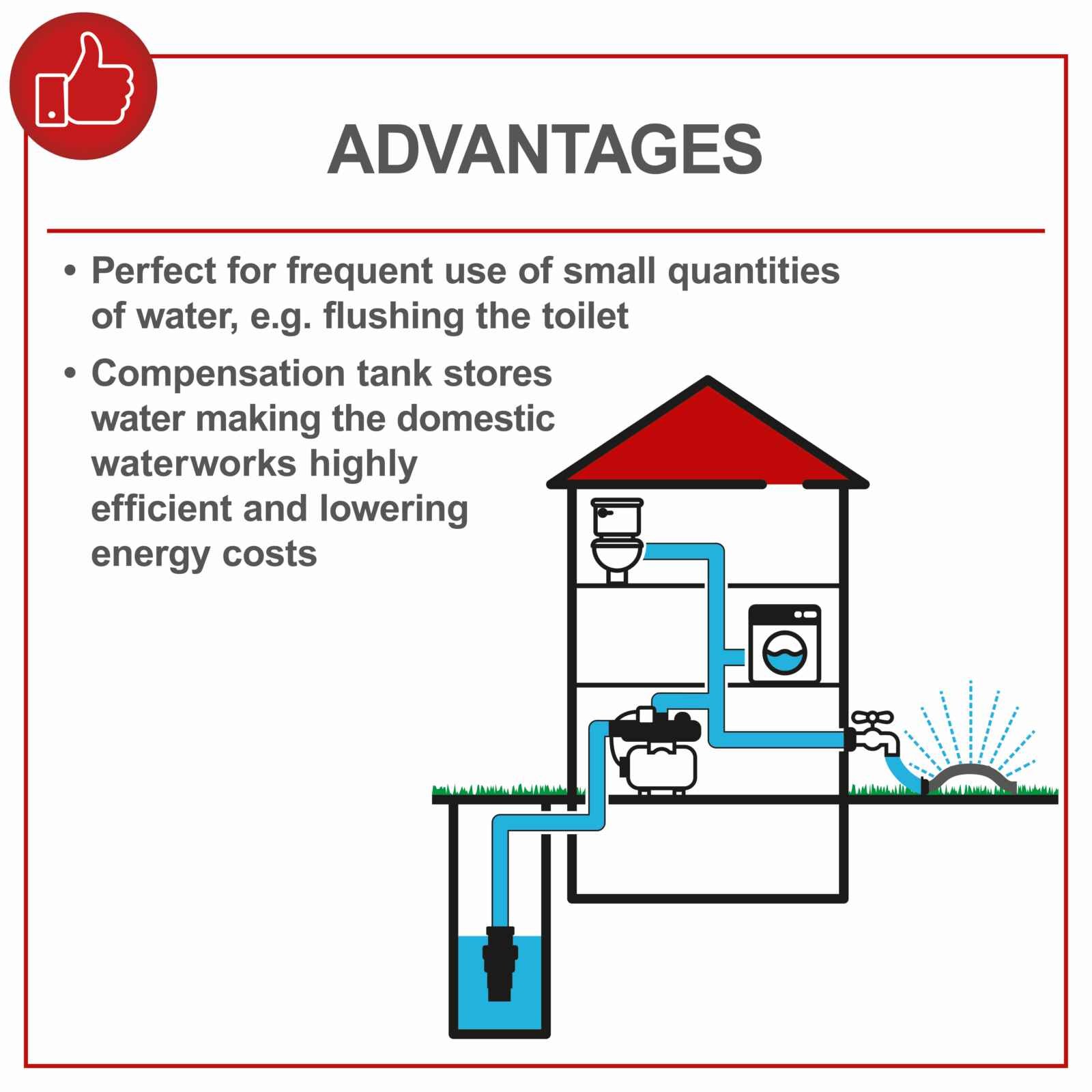 Подходяща за честа употреба на малки количества вода (напр. за тоалетно казанче)
