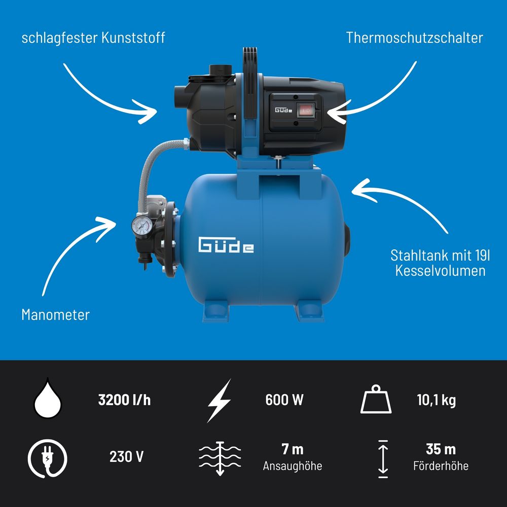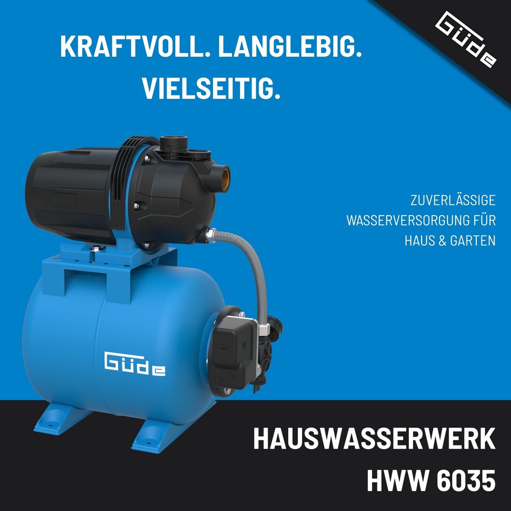Хидрофорната помпа за вода Güde HWW 6035 осигурява автоматично водоснабдяване за дома, двора и градината. Подходяща е за използване с дъждовна вода, подпочвена вода, както и за изпомпване на вода от кладенци и цистерни. Помпата е оборудвана с 600 W мотор и осигурява дебит до 3200 л/ч с максимален напор 35 м. Максималната смукателна височина достига 7 м. Здравият 19-литров стоманен съд поддържа постоянен воден резерв и стабилно налягане в системата. Корпусът на помпата е изработен от удароустойчива пластмаса и разполага с механично уплътнение за дълъг експлоатационен живот. Вградените манометър и пресостат осигуряват автоматичен контрол на налягането, а термичната защита предпазва двигателя от претоварване.