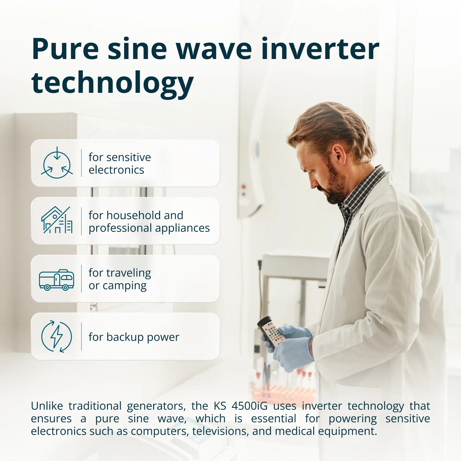 Вграденият модул с микропроцесорно управление контролира работата на генератора и осигурява стабилен изход от 230V 50Hz с чиста синусоидална вълна — идеален за захранване на чувствителна електроника.