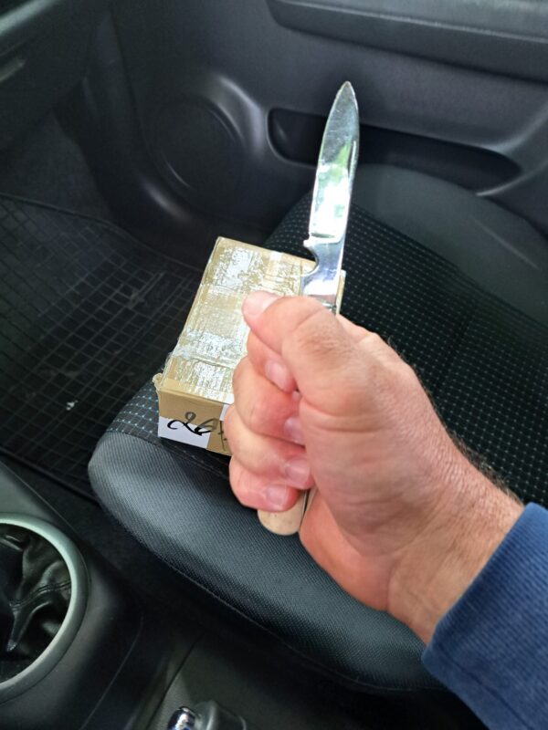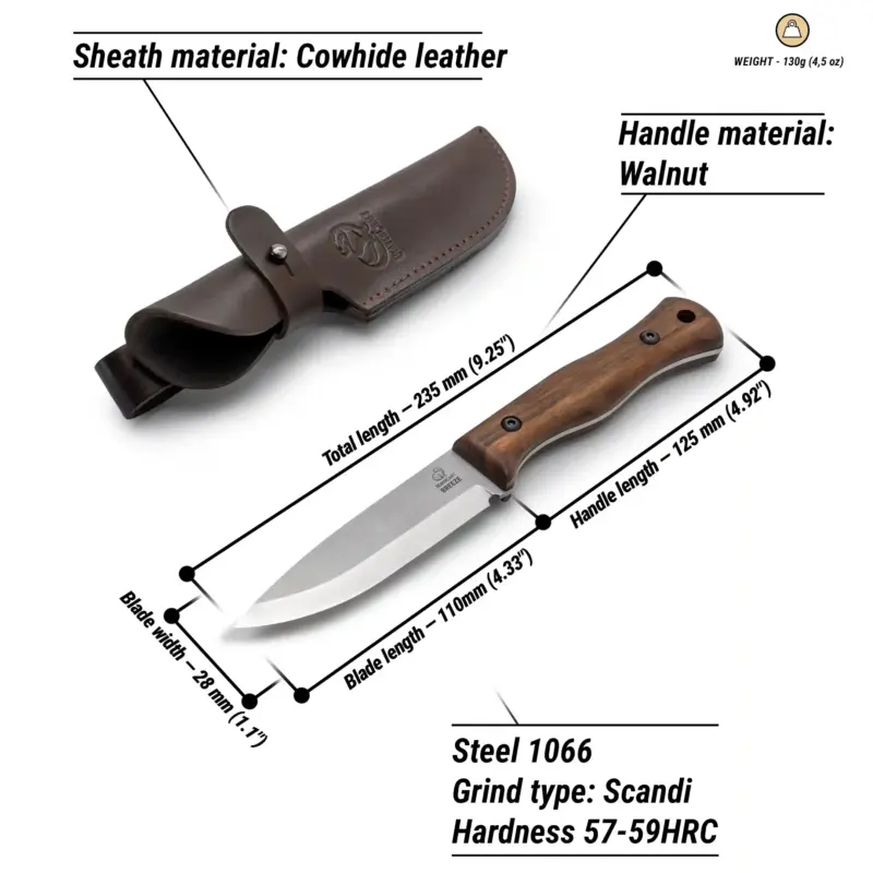 Канията от телешка кожа е проектирана за удобно носене около врата и осигурява бърз и лесен достъп до ножа, когато е необходим. Практичен и създаден да издържа във времето, този нож за носене на врата е задължителен елемент за всеки, който цени качествената изработка и функционалността на своето оборудване.
