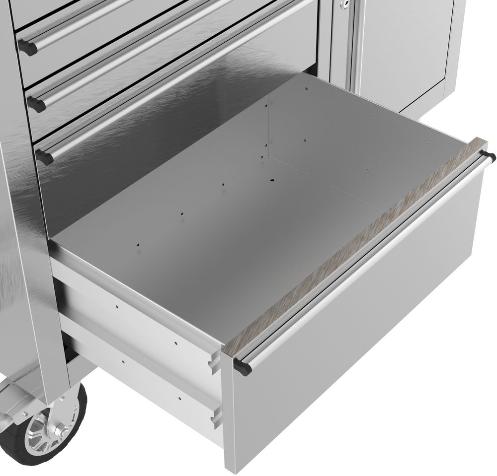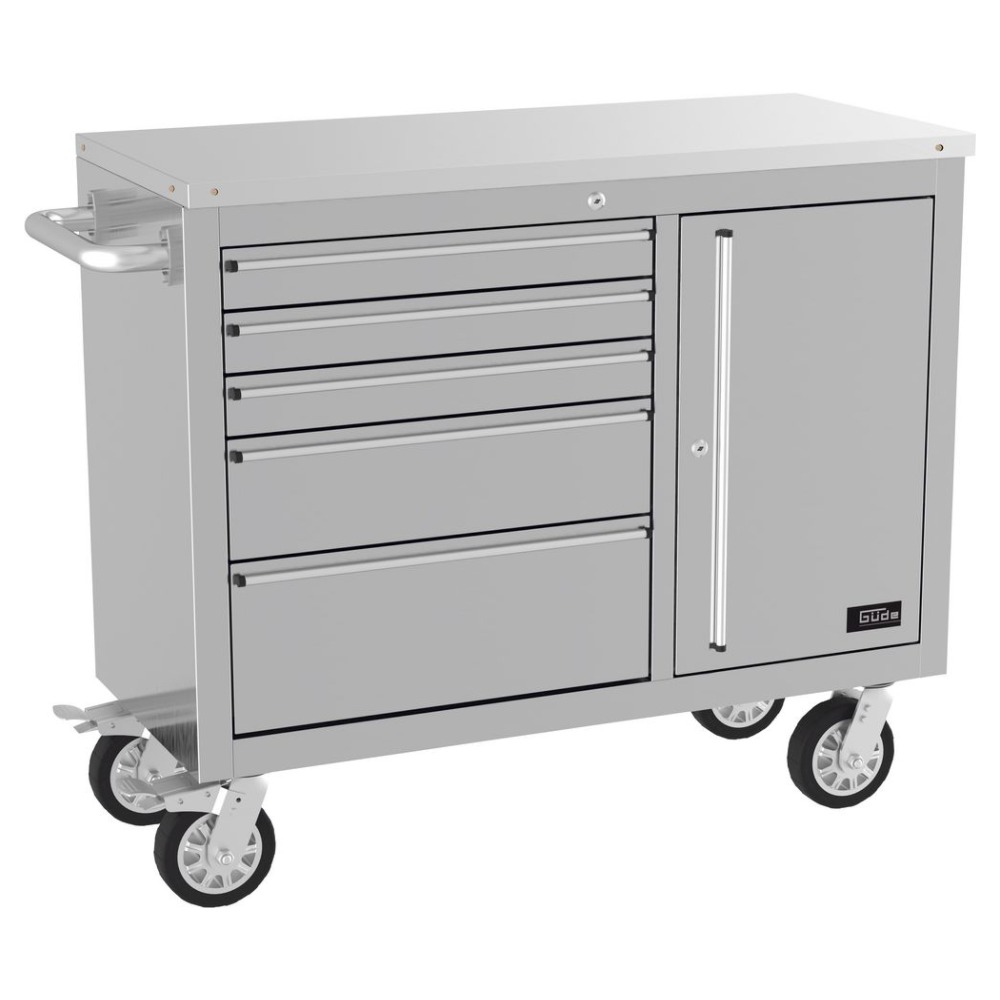 Висококачествена количка за инструменти GÜDE GW 5/1 INOX, изработена изцяло от неръждаема стомана по европейски стандарт X6Cr17 (EN 14016). Устойчива е на сярни съединения и органични киселини, включително лимонена киселина, което я прави подходяща за използване на открито и в агресивна среда. Плотът е изграден от здрава гумена основа с дебелина 30 мм, покрита с неръждаема ламарина 0.75 мм. Масата разполага с 5 заключващи се чекмеджета, един шкаф с отделна ключалка, лагерни водачи и подсилено голямо чекмедже. Четирите въртящи се колела (две със спирачки) и стабилната дръжка осигуряват лесна подвижност и стабилност по време на работа.