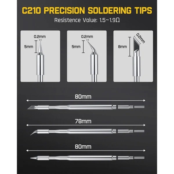 Окомплектован с човки 4 бр. C210 (C210-I, C210-IS, 2pcs C210-K) устойчиви на окисляване,с  дълъг експлоатационен срок. Време на загряване минимум 7 секунди. Окомплектован с пинсети и помпичка за тинол