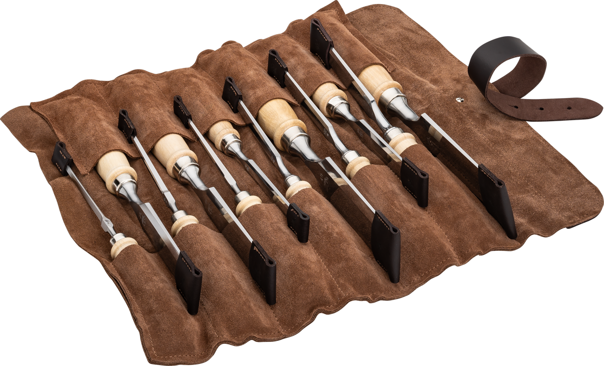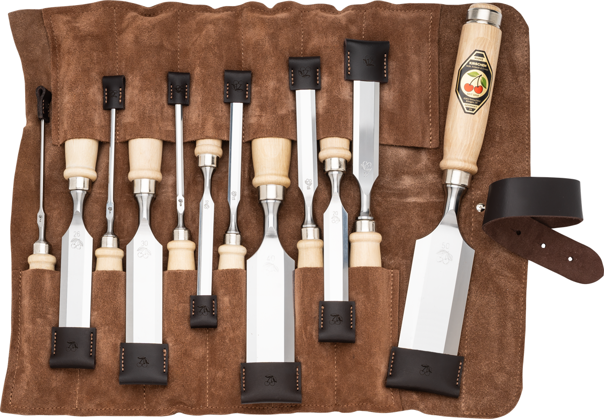 Всички дърводелски длета са безопасно съхранени, а ръбовете им са защитени с кожени протектори за ръбове.