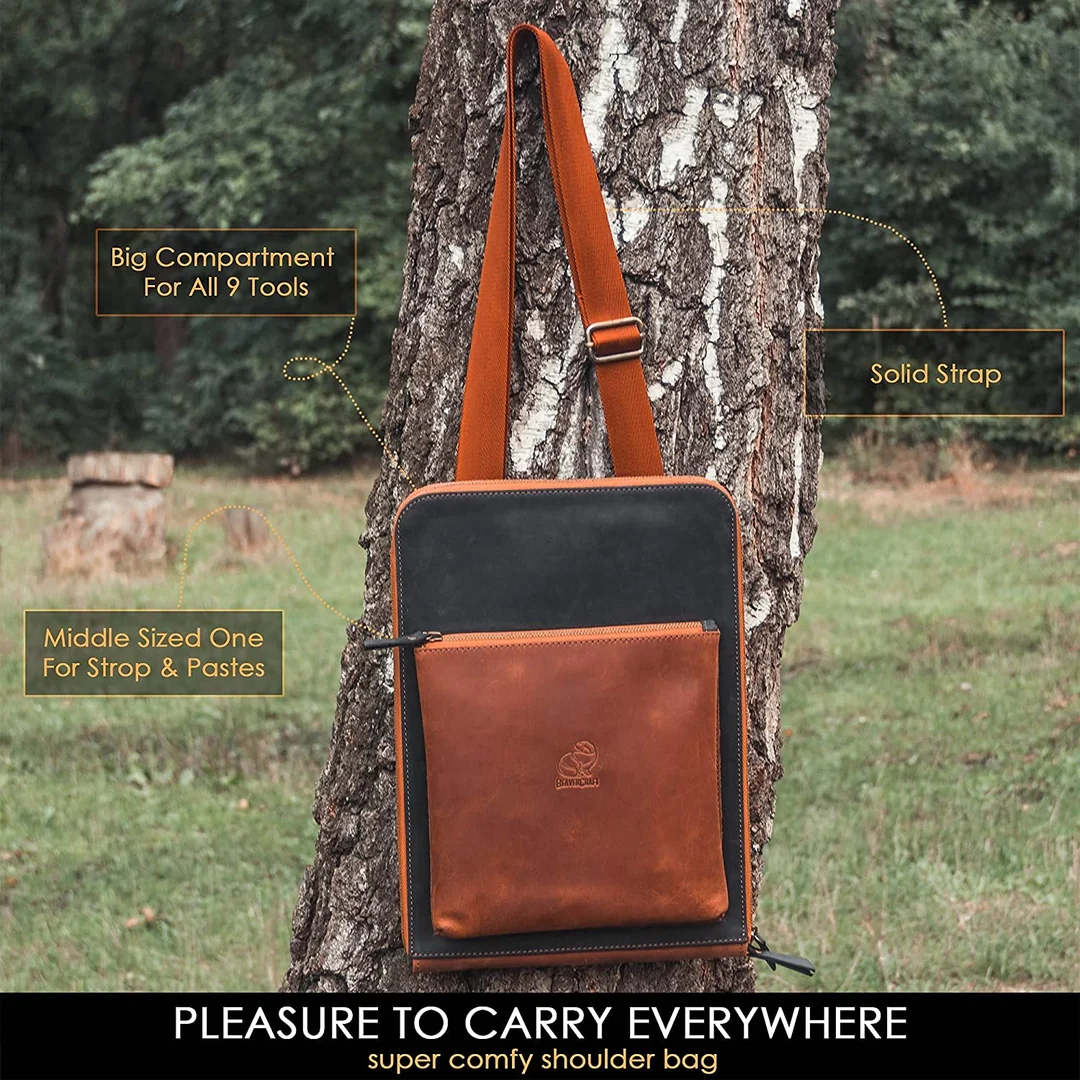 Всичко в този комплект е проектирано до най-малкия детайл, за да ви осигури максимално приятно изживяване при резбоване. Включени са джобен кожен строп за заточване и 3 полиращи пасти, което го прави перфектно „всичко в едно“ решение. Всички инструменти са спретнато подредени в стилен кожен калъф, предназначен за съхранение и защита на вашите инструменти за дърворезба.