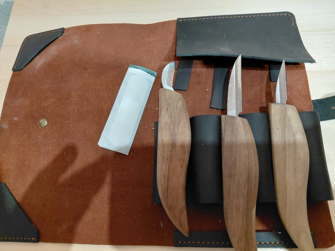 Ножовете са здрави и удобни. Нямам додтатъчно опит да преценя колко добре са заточени от производителя, но е достатъчно за мекото липово дърво. Кожения калъф е добре изработен и пристигна в чудесно състояние, но ако искаш да запазиш идеалния вид на гладката кожа отвън, ще има нужда от някакво третиране или внимателно пазене (светлите черти по кожата на моята снимка след няколко отваряния и затваряния са напълно козметични)