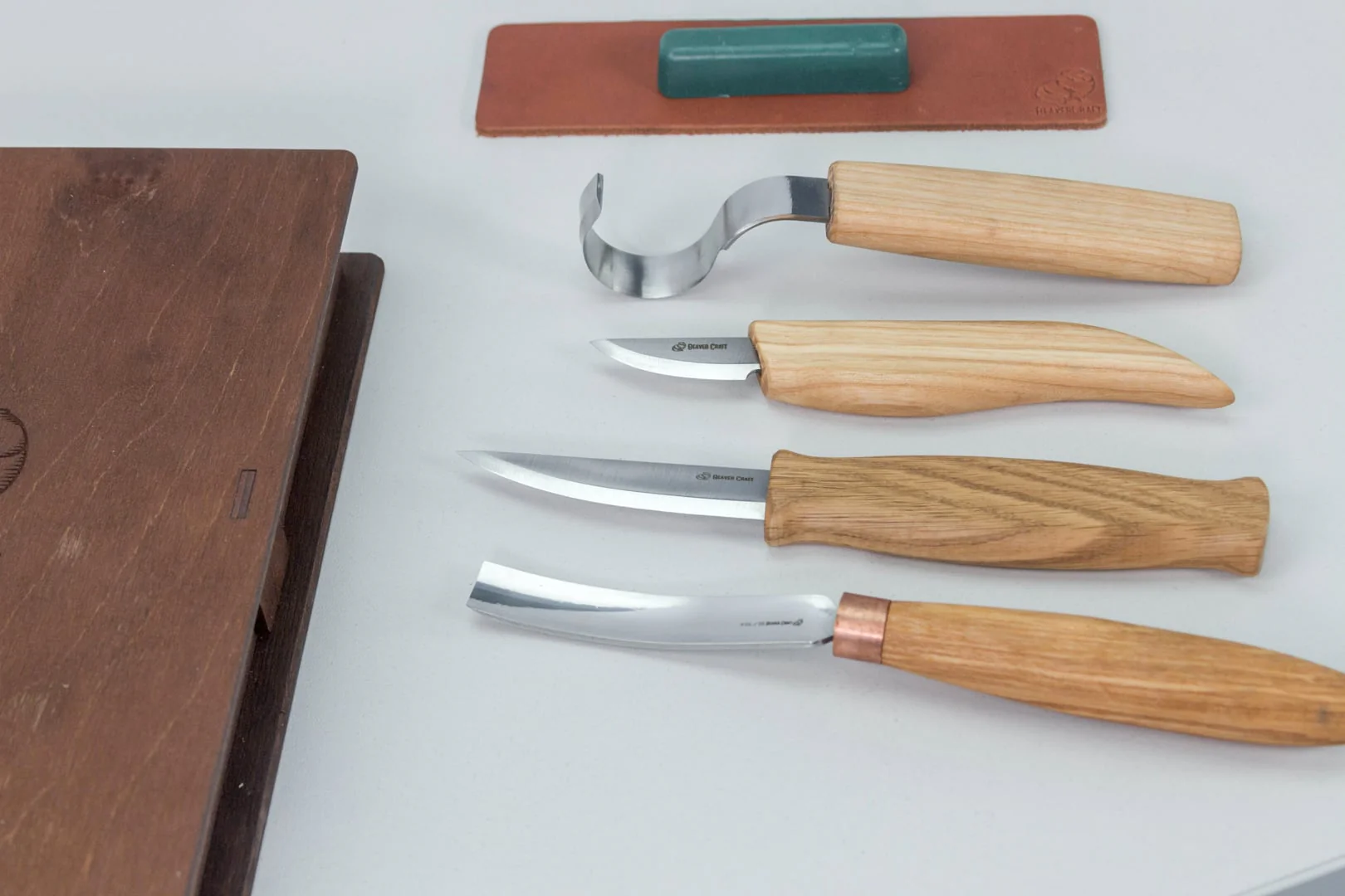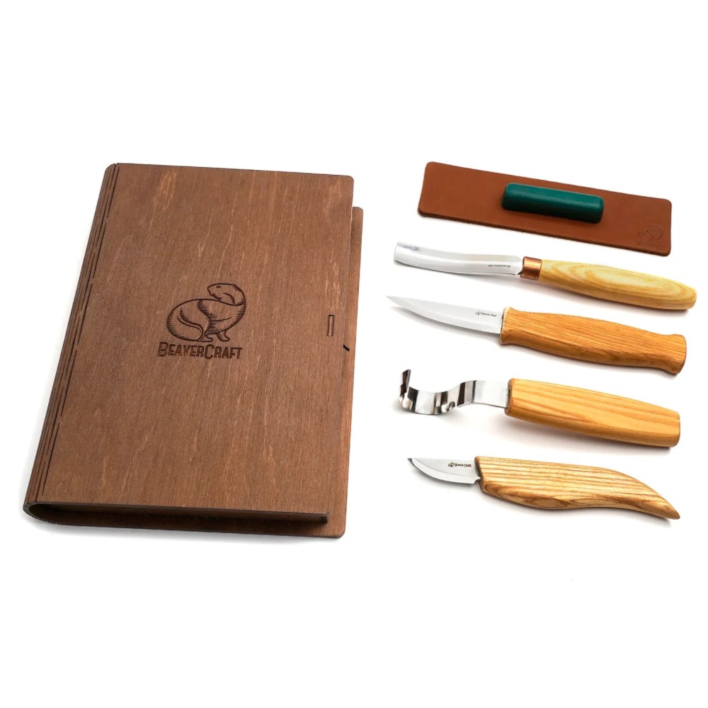 Търсите подарък за някой, който обича дърворезбата? Или самият вие харесвате дърворезбата и креативно опакованите комплекти? Ако е така, сте на правилната страница. Това е комплектът от резбарски ножове BeaverCraft S43 book в кутия тип книга подходяща за резба на лъжици, кукси, купи и други. Комплектът включва нож за лъжици, нож за обща резба, нож за резба на детайли и извито длето. Инструментите пристигат остри и готови за употреба веднага след разопаковане, а остриетата са изработени от висококачествена въглеродна стомана. Благодарение на ергономичните дръжки няма да усещате умора в ръцете и ще можете да работите с часове върху проекта си. Тези инструменти са подходящи както за мека, така и за твърда дървесина. С този комплект получавате не само инструментите за резба, но и кожен ремък и полиращо блокче, за да поддържате ножовете си винаги в отлично състояние.