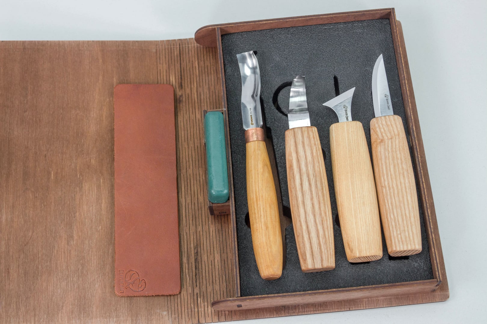 Търсите подарък за някой, който обича геометричната дърворезба? Или самият вие харесвате дърворезбата и креативно опакованите предмети? Ако е така, сте на правилната страница. Този комплект от 4 ножа е идеален както за начинаещи, така и за професионални резбари. Комплектът идва в подаръчна опаковка – калъф под формата на книга! Той е най-подходящ за обща дърворезба и за детайлна, прецизна работа. Дръжките на ножовете са от ясеново дърво, импрегнирани с ленено масло, което гарантира дълготрайност. Всички инструменти от комплекта пристигат остри и готови за употреба веднага след разопаковане, а остриетата са изработени от висококачествена въглеродна стомана. Благодарение на ергономичните дръжки няма да усещате умора в ръцете и ще можете да работите с часове върху проекта си. В комплекта получавате още черен кожен ремък и полираща паста, за да поддържате инструментите си в отлично състояние.