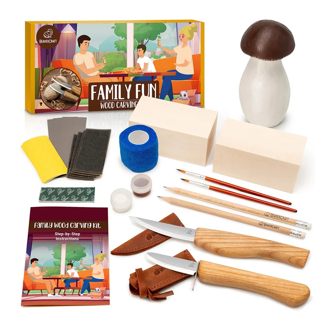 Този цялостен комплект за дялкане включва всички необходими инструменти и материали, за да започнете с дърворезбата. В него ще откриете два висококачествени ножа за дърворезба с кожени кании – един за възрастни и един за деца. И двата ножа са оборудвани с издръжливи и надеждни остриета от въглеродна стомана и ергономични дървени дръжки от дъб.