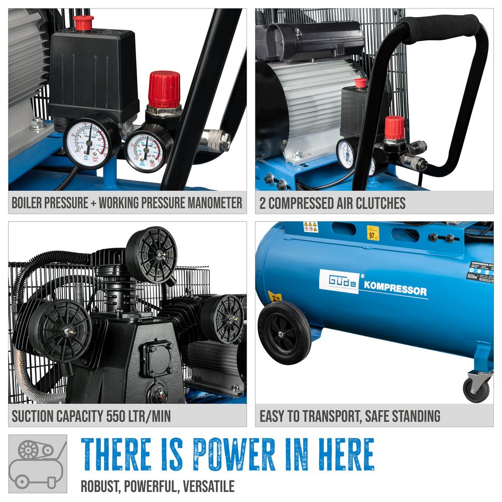 GÜDE 551/10/100 е здрав и ефективен 3-цилиндров компресор, предназначен за професионални приложения, при които се изисква голям дебит и стабилно налягане. С мощност 2,2 kW и резервоар от 100 литра, той осигурява надеждна работа при максимално налягане 10 бара. Благодарение на редуктора на налягането и автоматичния пресостат, работното налягане се настройва лесно, а компресорът се включва отново автоматично при спад под зададената стойност. Подходящ е за пясъкоструене, боядисване, надуване на гуми и работа с пневматични инструменти. Удобната транспортна дръжка, здравите пластмасови колела и гумените опорни крака осигуряват лесно преместване и стабилност при работа.
