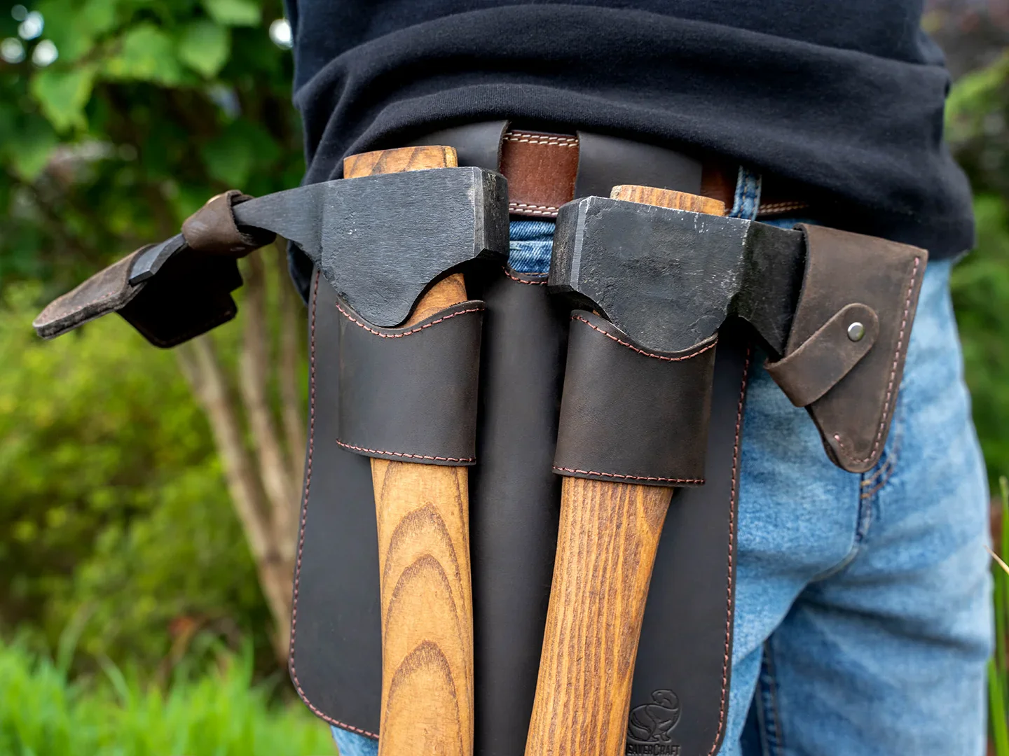 Подгответе се да овладеете занаята си със двойната кожена халка за брадви S-AX1/AX2 – перфектната комбинация от организация и стил в един впечатляващ аксесоар.