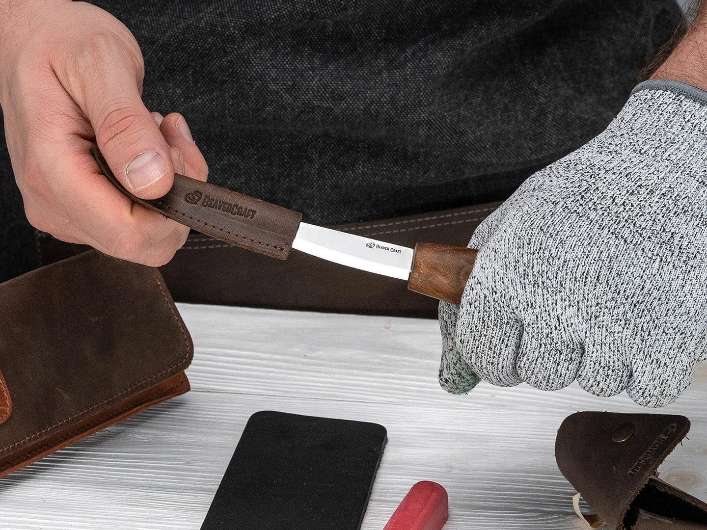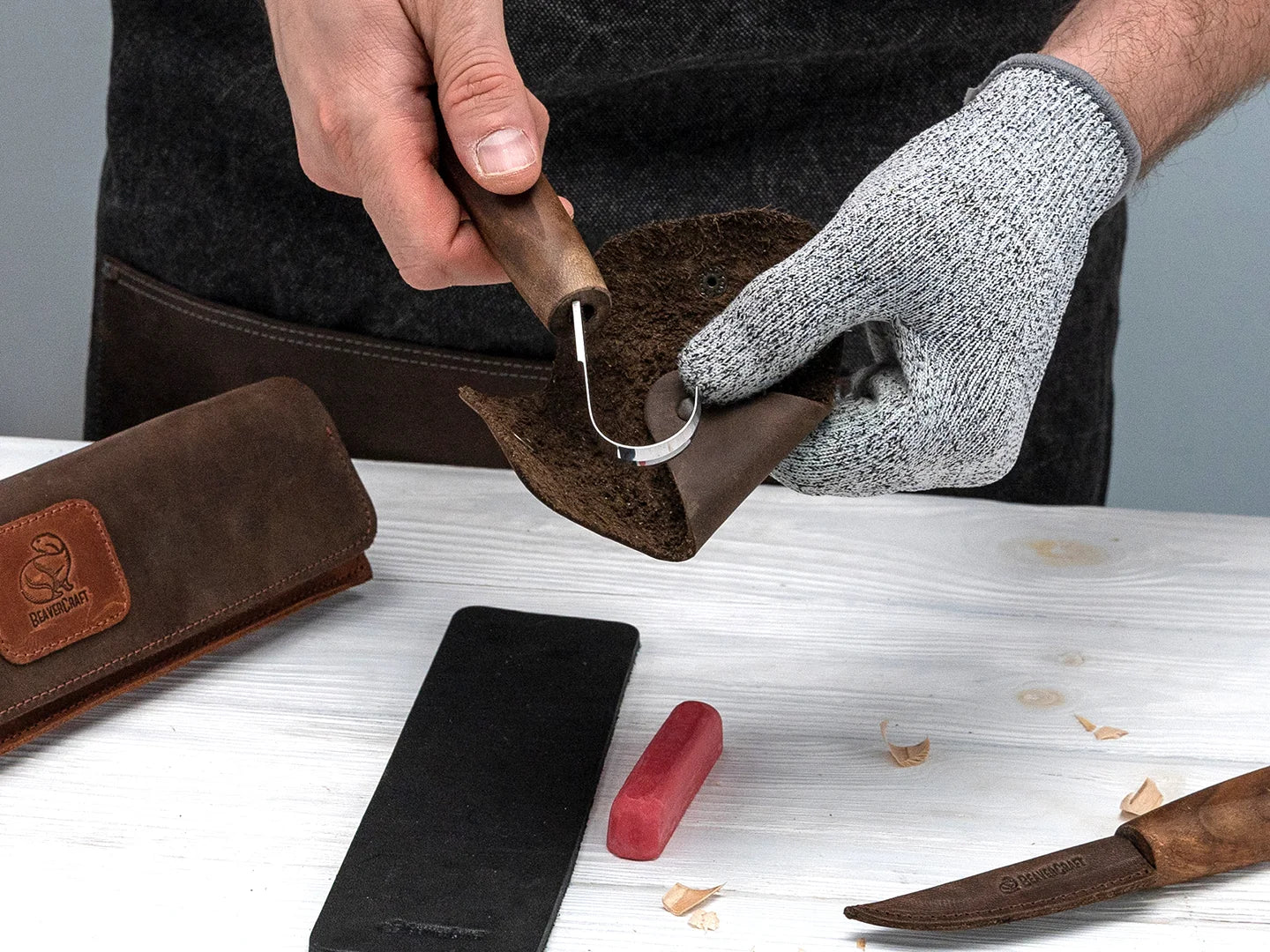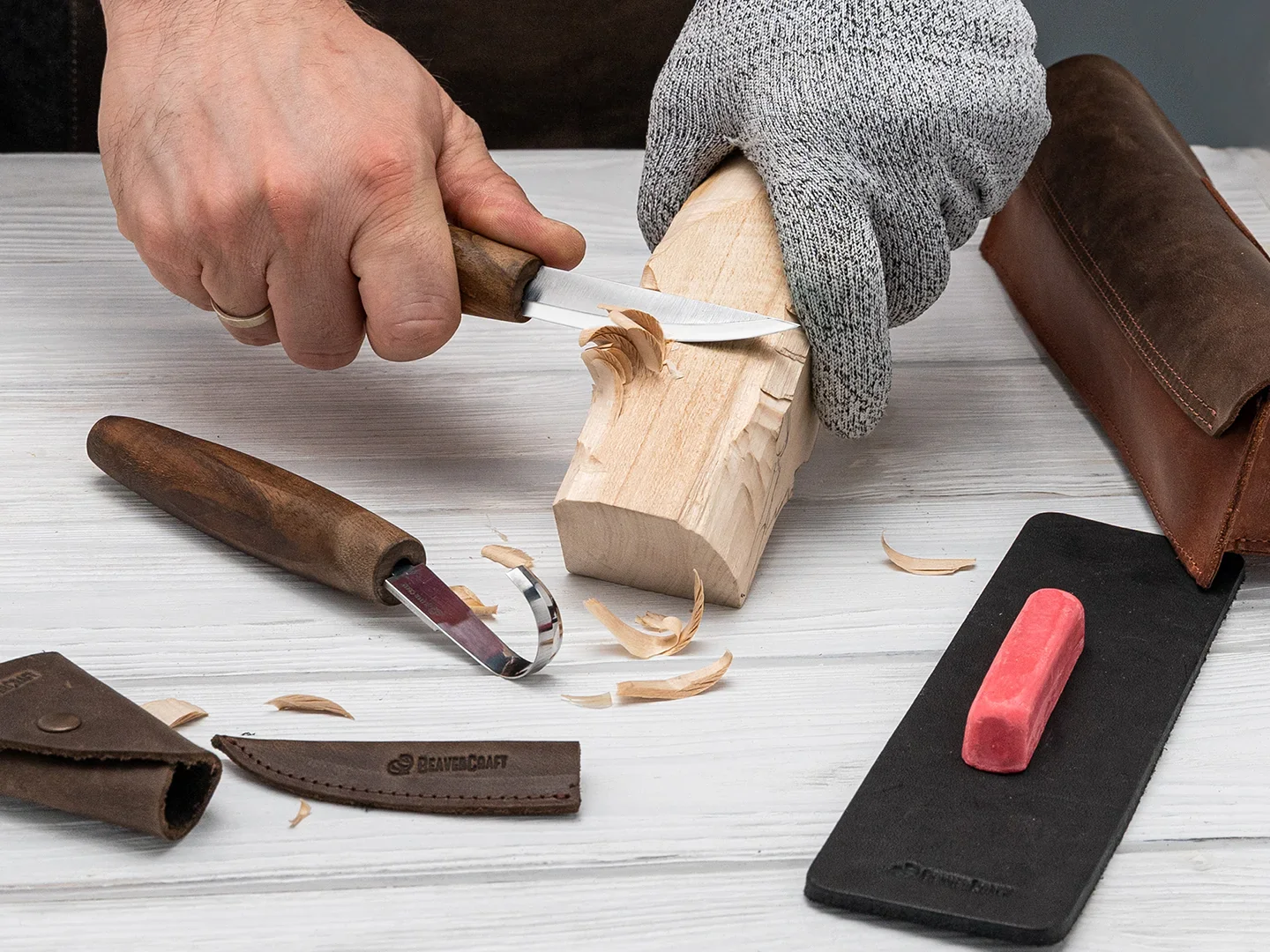 И това не е всичко – комплектът включва и основни аксесоари, като кожен ремък за заточване (строп) и полираща паста. Всичко необходимо за началото на вашето резбарско приключение е на една ръка разстояние, осигурявайки плавен и приятен работен процес.