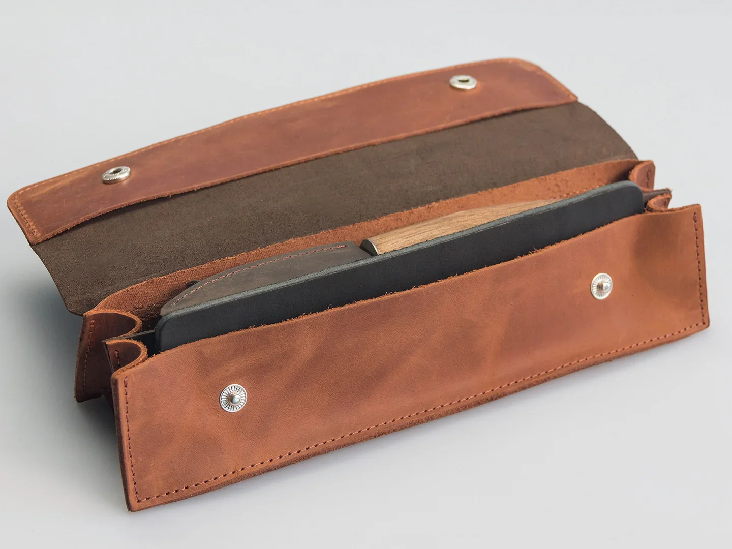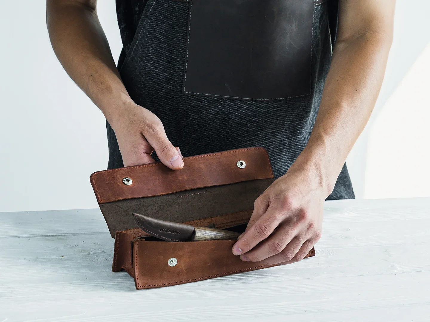 За да бъдат инструментите ви защитени и елегантно подредени, сме включили здрав навиващ се калъф, изработен от висококачествена кожа в красив кафяв нюанс. Той не само предпазва ценните ви инструменти, но и добавя допълнителна доза стил към вашето занимание с дърворезба. Калъфът позволява лесно съхранение и удобно пренасяне на комплекта, където и да ви отведе вдъхновението.
