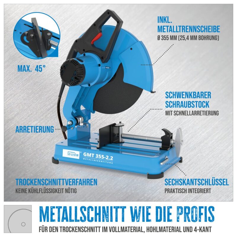 Машината за рязане на метал Güde GMT 355-2300 е предназначена за прецизно сухо рязане на различни метални материали – стомана и цветни метали, кръгли тръби, квадратни профили и плътен материал. С мощност от 2300 W и включен диск с диаметър 355 мм, моделът осигурява достатъчен резерв от мощност за натоварени приложения в работилници и строителни обекти. Функцията мек старт гарантира плавен старт и по-дълъг експлоатационен живот на двигателя. Интегрираното менгеме с бързо фиксиране позволява сигурно и стабилно захващане на детайла. Машината може да се завърта за рязане под ъгъл от -15° до 45°, което я прави подходяща за прецизни срезове и подготовка за заваряване. Работи чрез сухо рязане, без необходимост от охлаждаща течност.