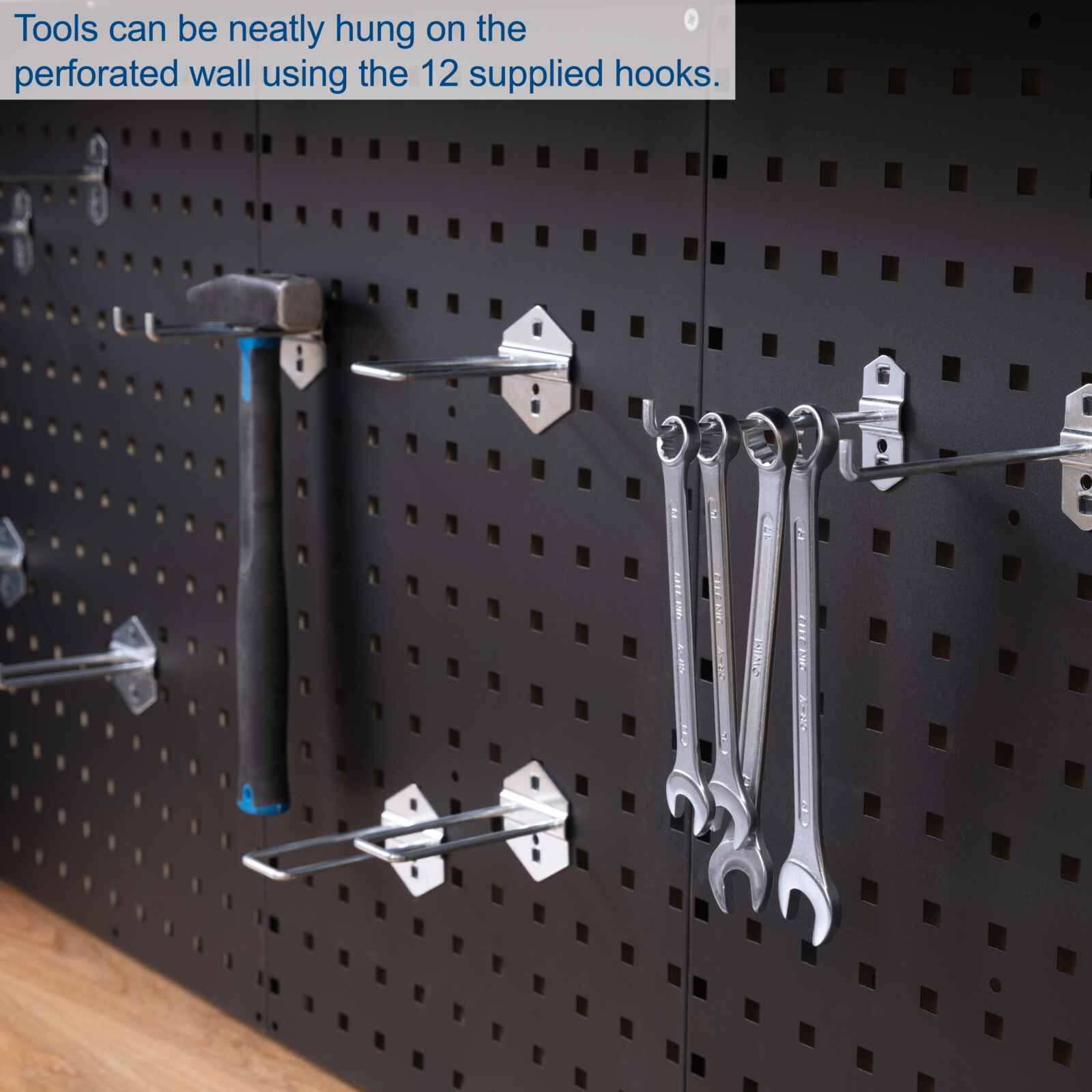 Голяма перфостена за със стандартни отвори и отстояния за нареждане на инструменти с 12 куки.