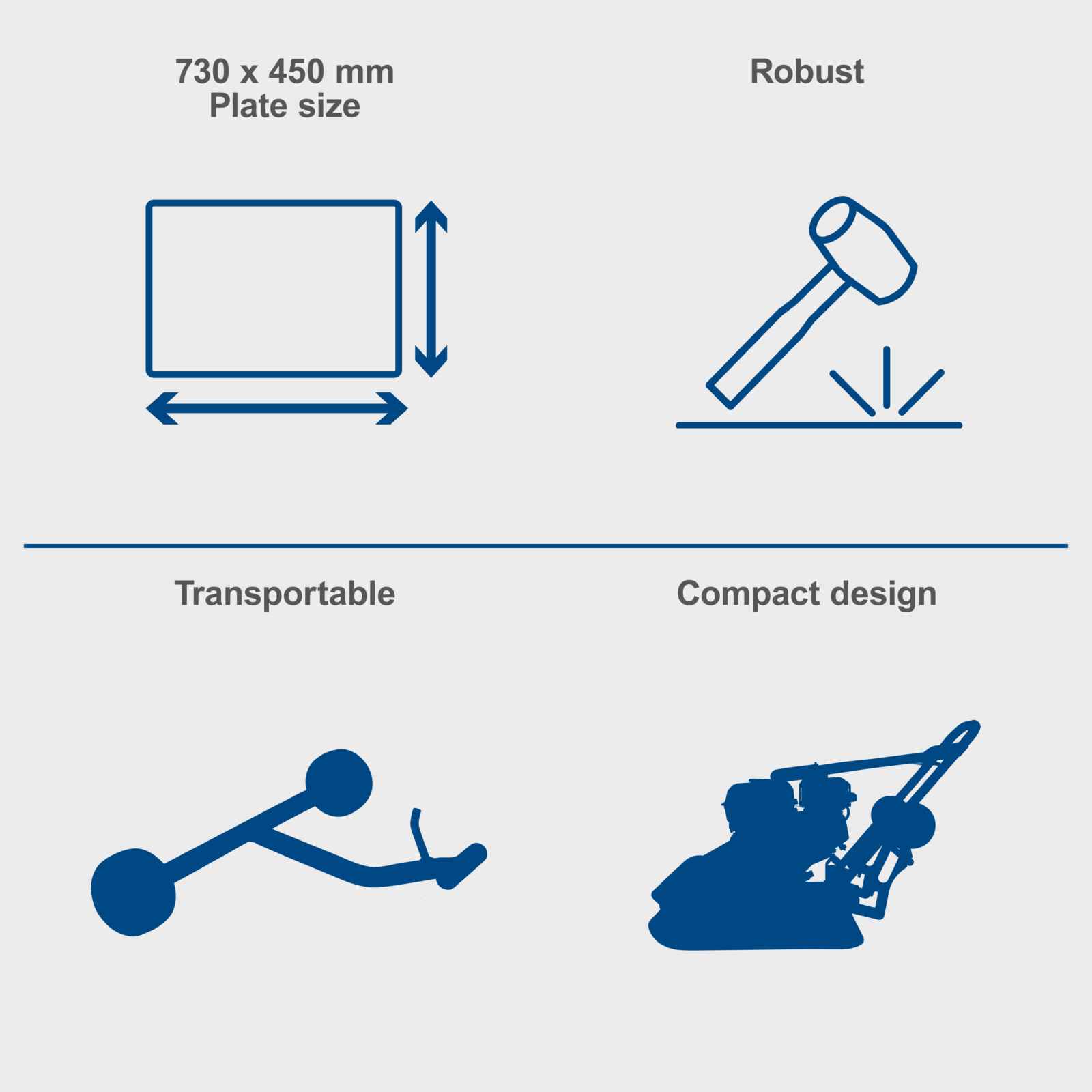 Стабилната вибрационна плоча (730 x 450 мм) с дебелина 8 мм, двойна вибрационна система, вградени транспортни колела, възможност за повдигане с кран, и включена гумена подложка осигуряват гъвкавост и безопасност при работа.