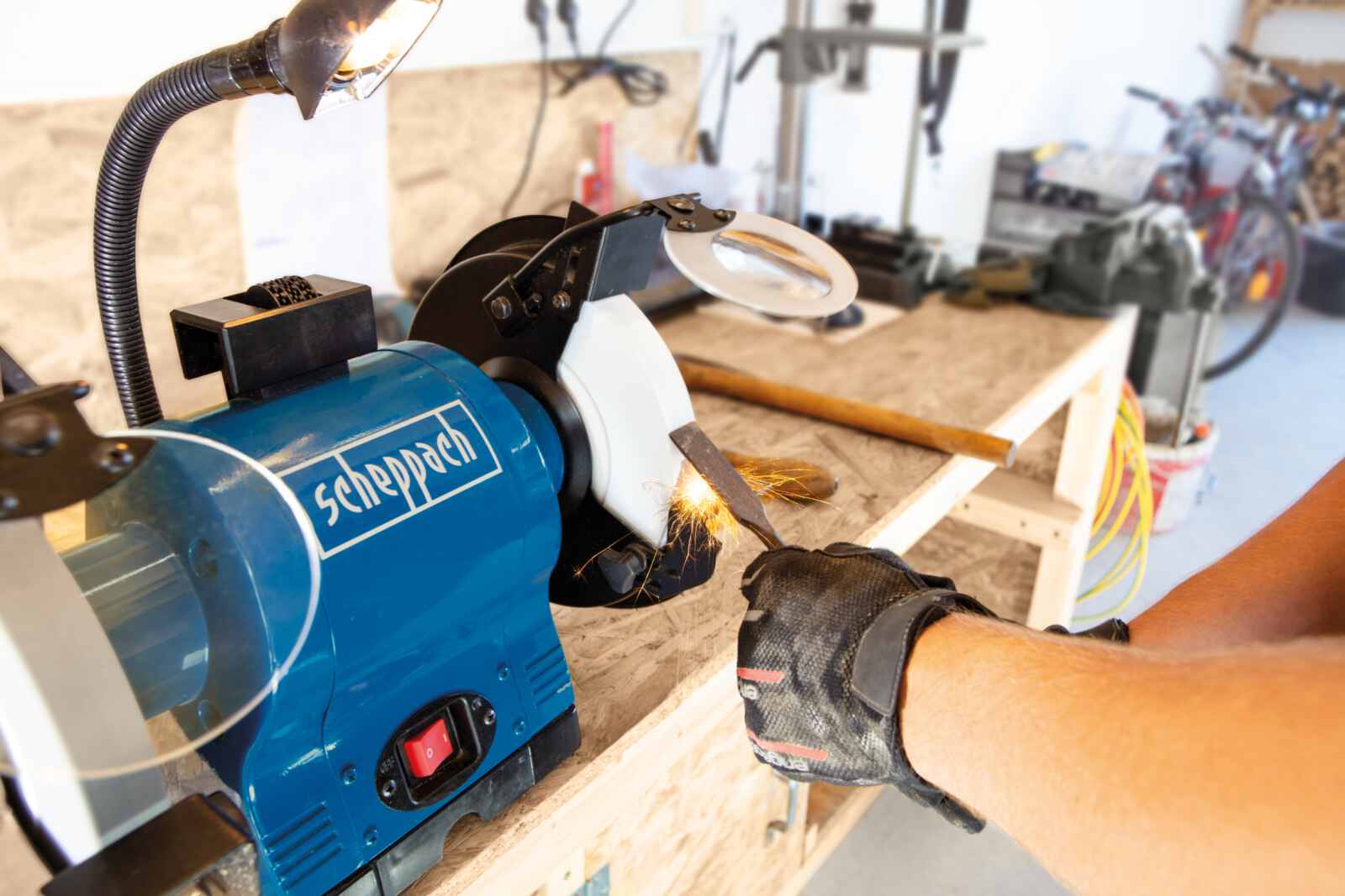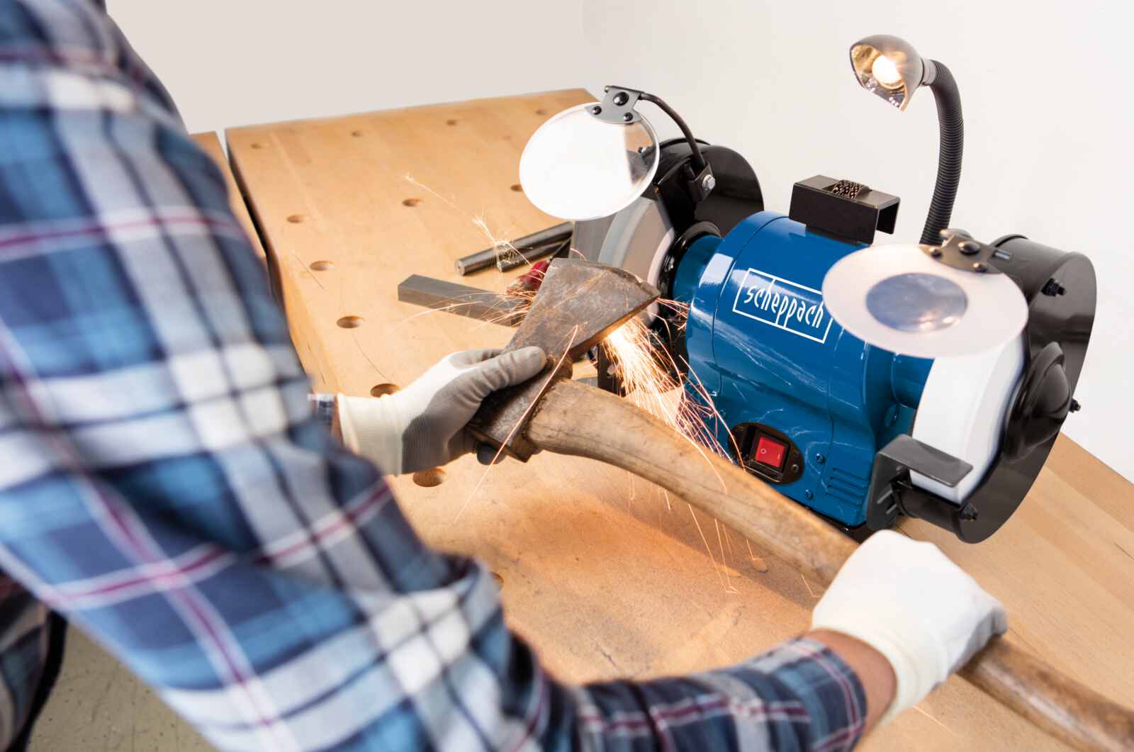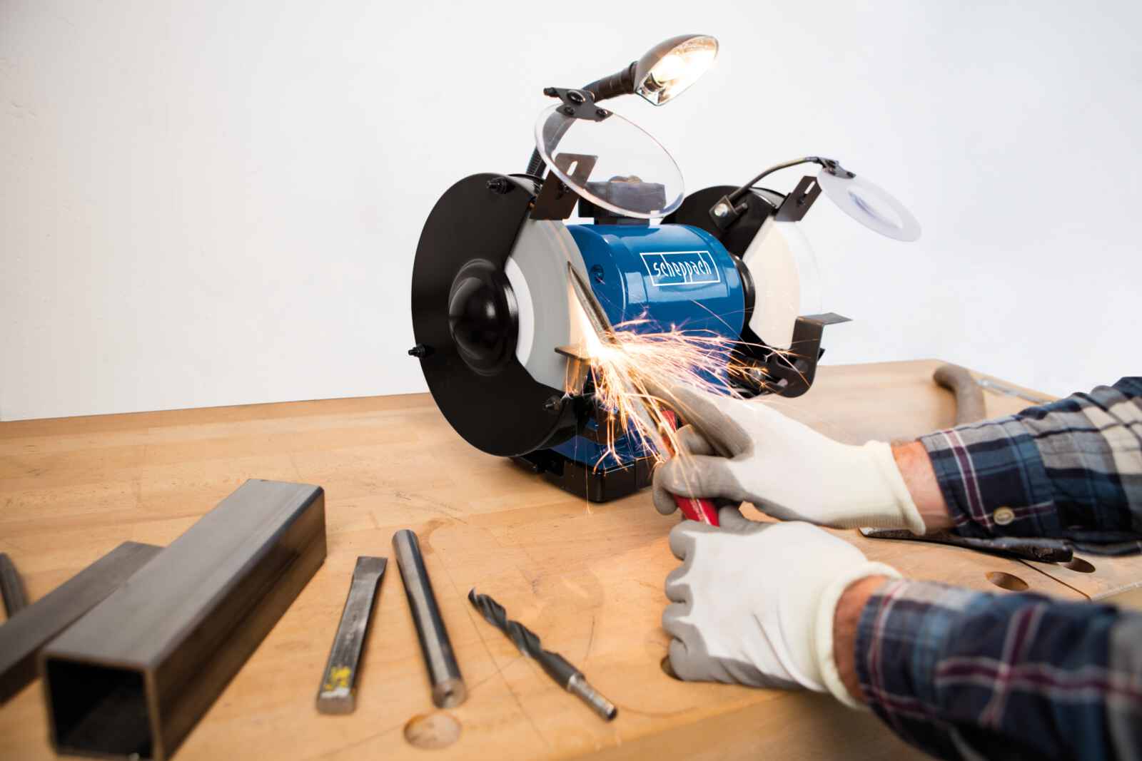 Здрав, мощен двустранен шмиргел с индукционен двигател и LED работна лампа – с гъвкаво рамо
