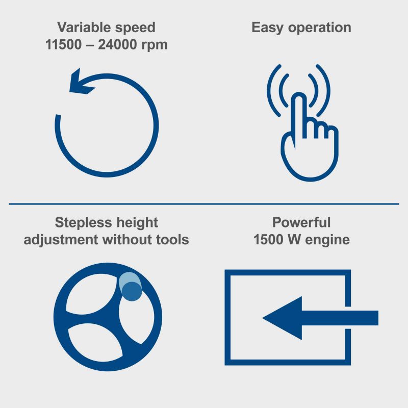 Регулиране на височината на фрезата с градуиран пръстен, , който може да бъде нулиран на 0 (1 оборот = 1 мм, 1 прорез = 0,05 мм).