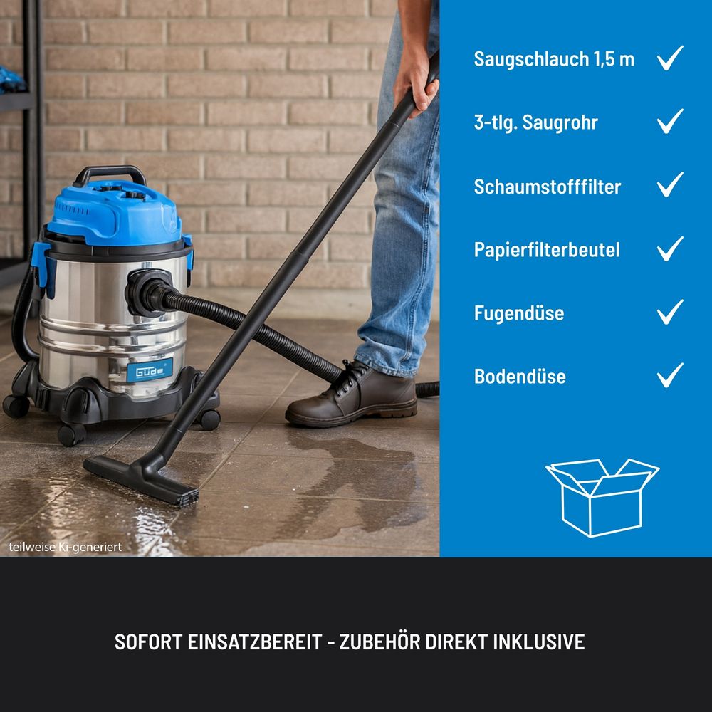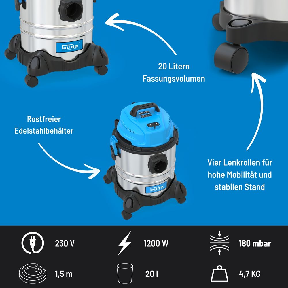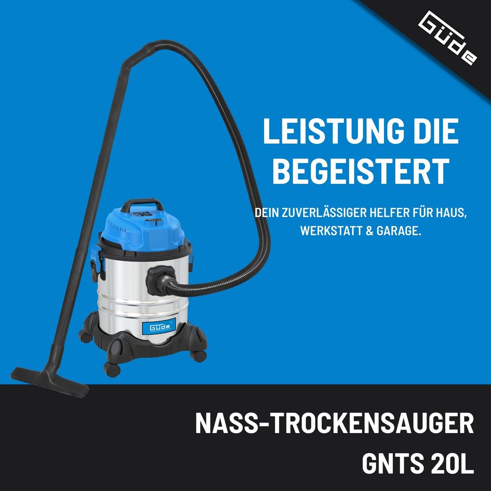 Прахосмукачката за сухо и мокро почистване GUDE GNTS 20L с 20-литров контейнер от неръждаема стомана осигурява надеждна производителност за дома, гаража или работилницата. Здравият корпус от неръждаема стомана гарантира дълъг живот и устойчивост, а четирите плавно въртящи се колела осигуряват отлична подвижност и стабилност по време на работа. Безстепенното регулиране на въздушния поток позволява оптимизиране на силата на засмукване според конкретната задача. Смукателната тръба от 3 части предлага гъвкавост при работа, а вграденият държач за аксесоари гарантира, че всички накрайници ще са винаги под ръка и подредени.