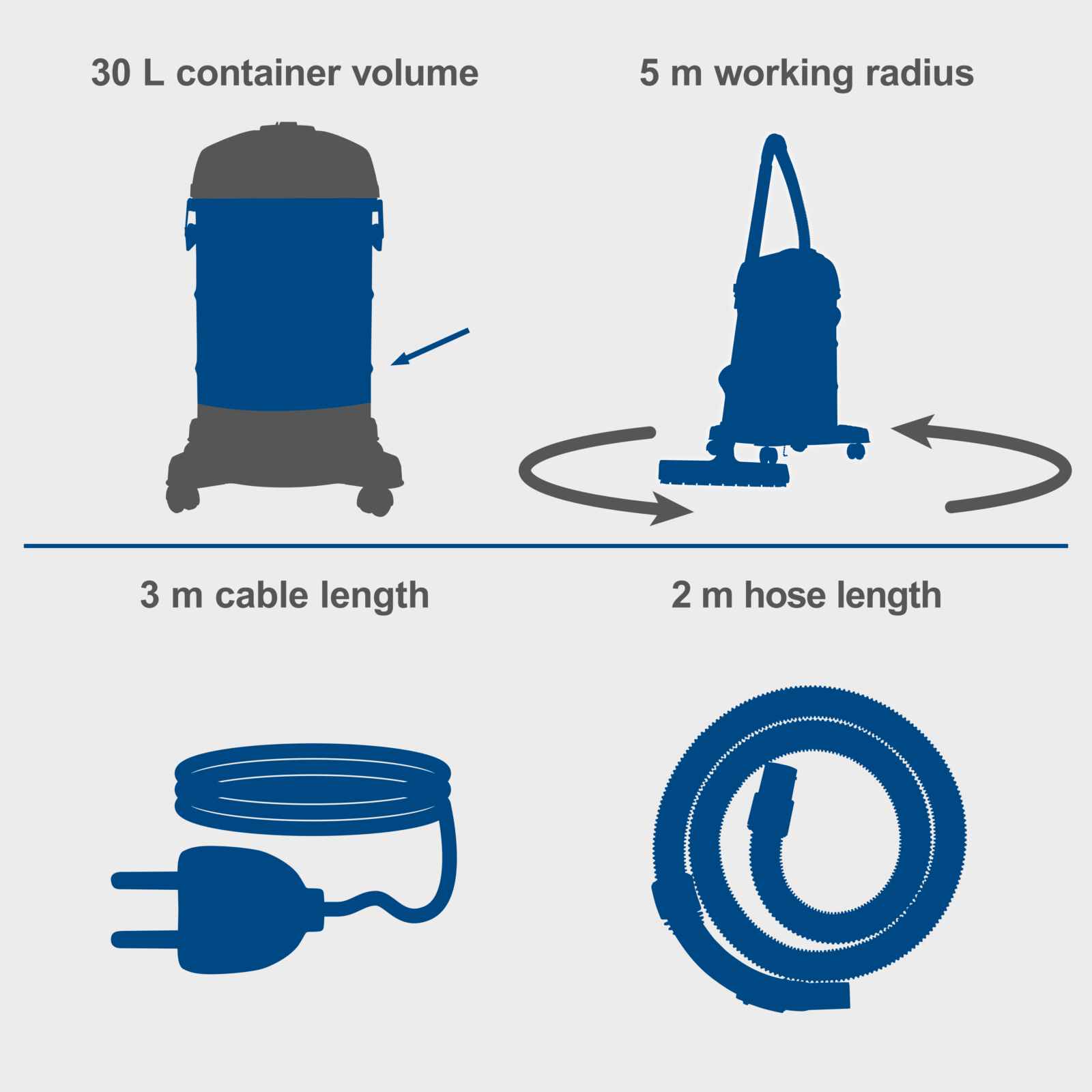 Scheppach VC30V2 е компактна електрическа прахосмукачка за сухо и мокро почистване с мощност на мотора от 1200W и сила на засмукване 20kPa. Благодарение на своята 3 в 1 функция – мокро, сухо и издухване – уредът е идеален както за дома, така и за строителния обект. Корпусът на машината е от устойчивa неръждаема стомана, с 30 л обем на контейнера и 4 стабилни колелца за лесно преместване. Включва всички необходими аксесоари за удобна и ефективна работа.