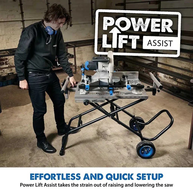Здрава колесна стойка за циркуляр за ъглово рязане. Powerlift, асистирано спускане и повдигане. (90 Nm сила)