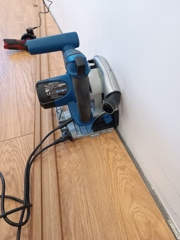 Другото му предимство е рязане на сянкови фуги до 16 мм. След като подът бъде положен, просто прокарайте триона по ръба, за да създадете идеална сянкова фуга – без необходимост от прецизно подрязване на паркета или ламината предварително. Благодарение на антиразкъсващата защита, можете да режете дори фурнировани дървени панели бързо и сигурно.