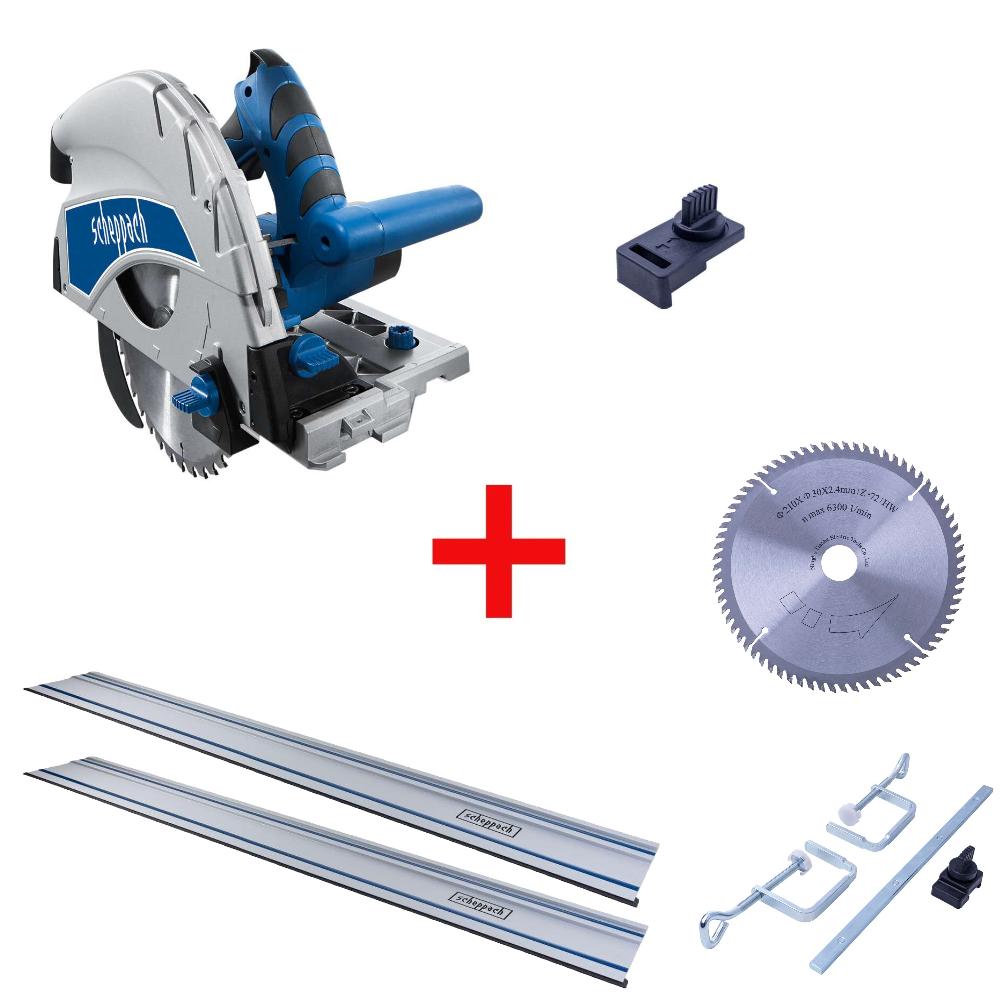 Ръчен потапящ циркуляр Scheppach PL75 + водещи релси + циркулярен диск 72 зъба + комплект аксесоари