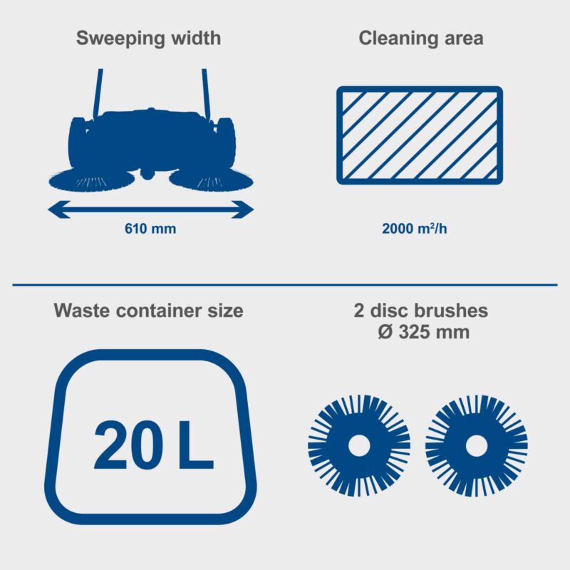 Метачната машина GÜDE GKM 800 е ефективно решение за поддържане на чистота около дома, в двора, пред магазина или в индустриални зони. Със своята ширина на метене от 800 мм, двойна основна четка и две странични четки, тя събира без усилие листа, прах и дребен боклук в 30-литровия контейнер.