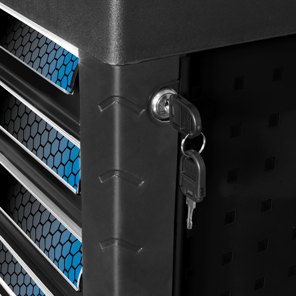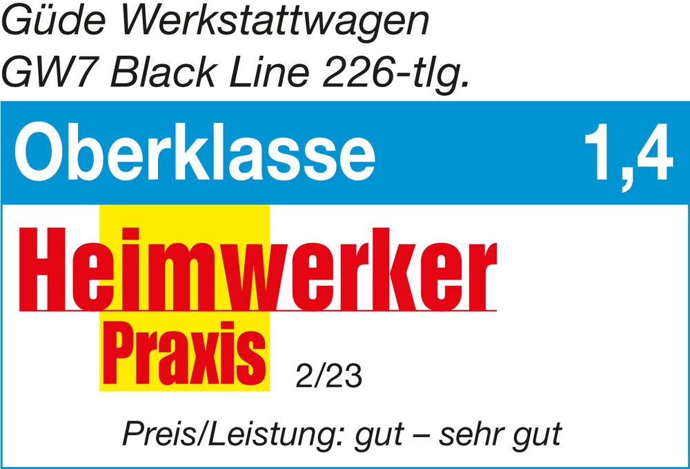 Работната количка GÜDE GW7 Black Line е изключително практичен помощник за автосервизи и домашни работилници. Тя идва с 226 инструмента, съхранявани безопасно в чекмеджета с пълно изтегляне и лагерно водене. Количката впечатлява с високата си стабилност, безопасност и възможности за разширяване чрез стандартни перфорации за монтаж на допълнителни аксесоари.