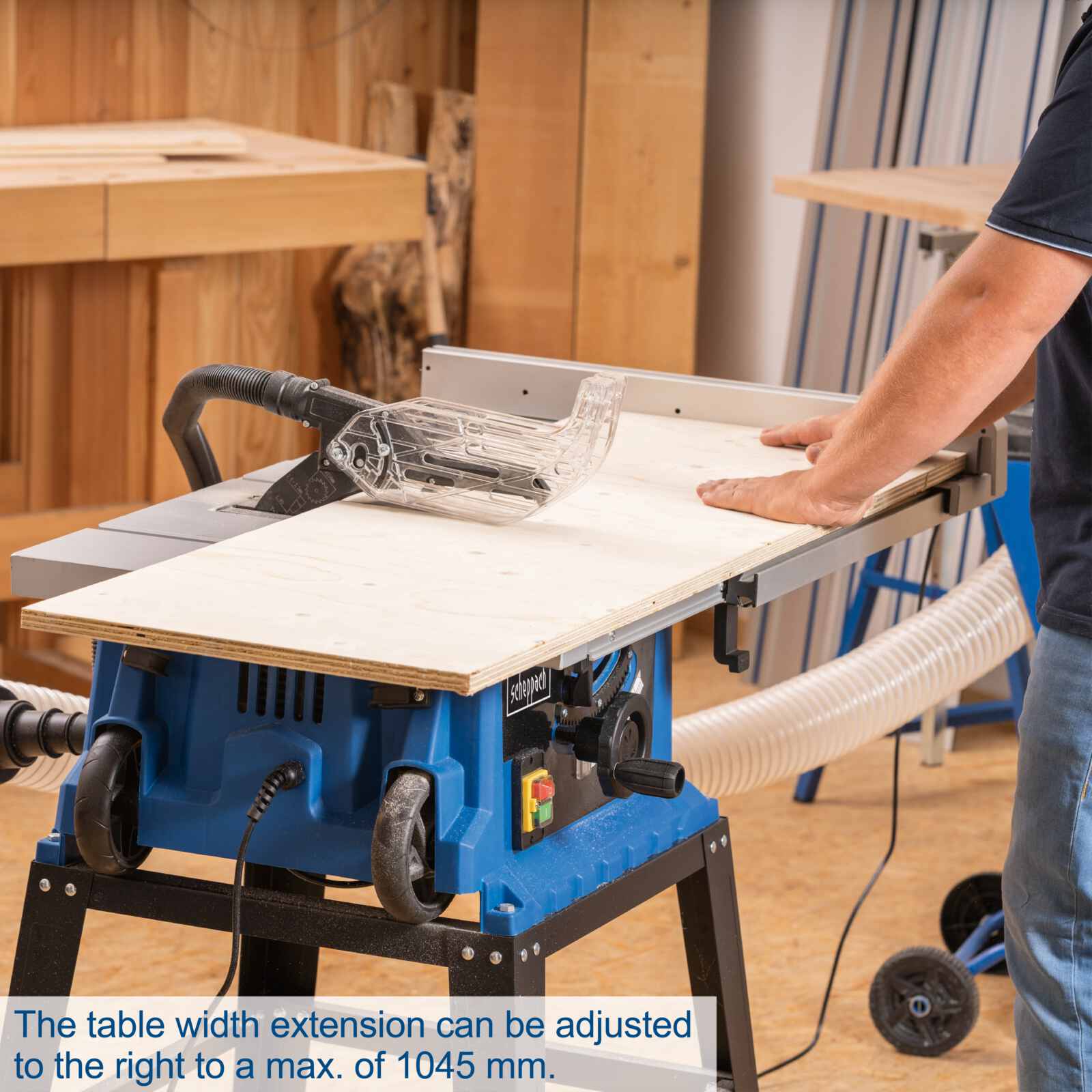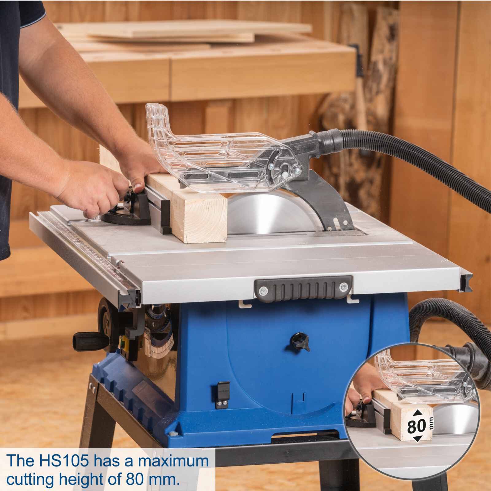 Scheppach HS105 е универсален стационарен циркуляр с мощен 2000 W мотор, подходящ както за сериозни домашни майстори, така и за професионални приложения. Машината предлага стабилен алуминиев плот с удължения, максимална дълбочина на рязане до 80 мм и регулируем наклон до 45°. Включени са защита за диска, аспирация, удобен паралелен упор с увеличително стъкло и упор за напречни срезове с ъглова настройка до ±60°.