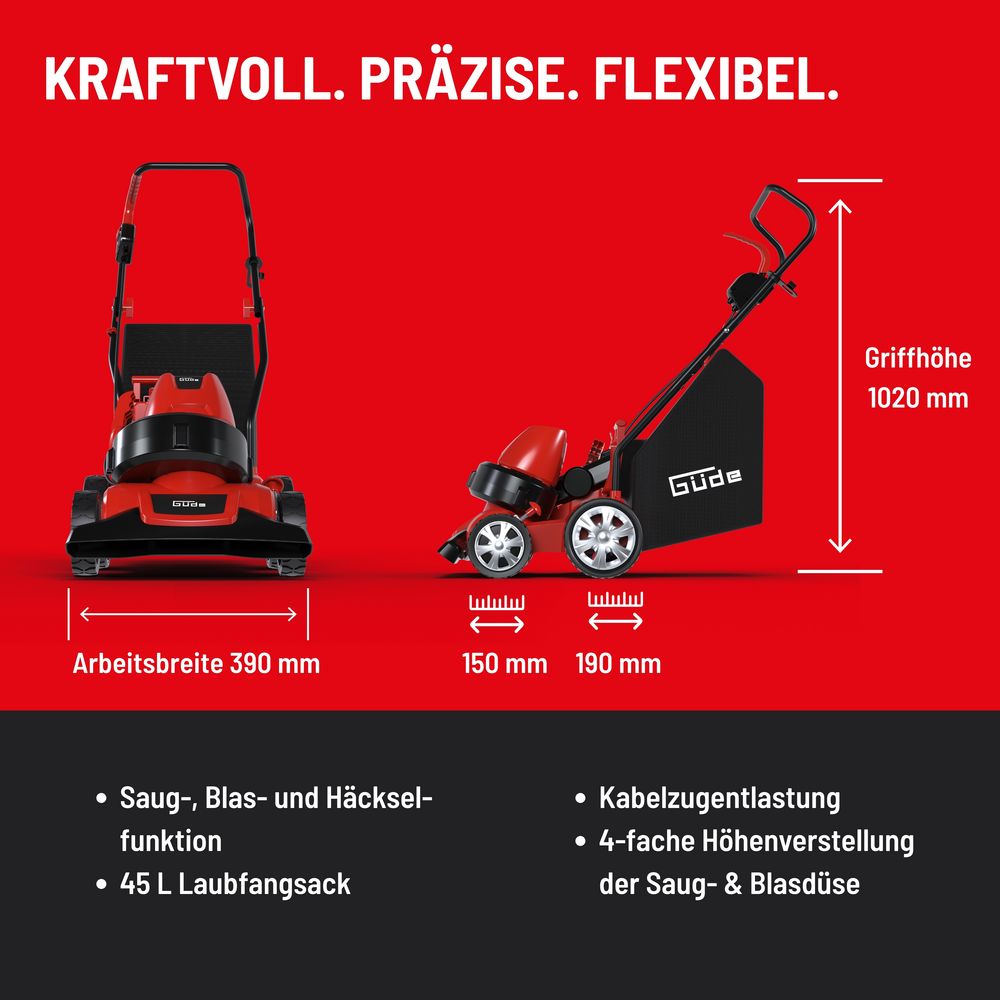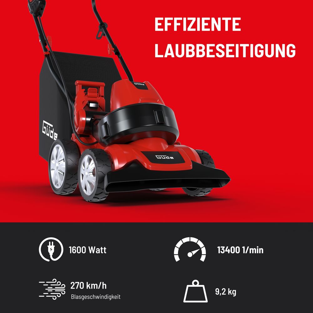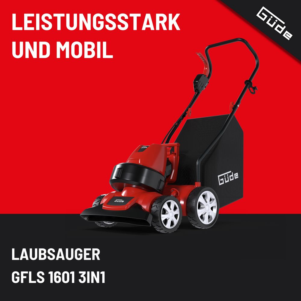 GÜDE GFLS 1601 3 в 1 е мощен и мобилен електрически листосъбирач с функции за духане, засмукване и надробяване. Идеален за почистване на дворове, градини, тротоари и тревни площи. С 1600 W мотор, дебит на въздуха до 840 м³/ч и скорост на въздушната струя до 270 км/ч, уредът ефективно премахва листа и леки отпадъци. Вградената функция за надробяване (съотношение 10:1) значително намалява обема на събраните отпадъци. Колелата с Ø190 мм отзад и Ø150 мм отпред улесняват движението върху неравни повърхности. Четирите позиции за регулиране на височината и удобна дръжка с височина 1020 мм осигуряват комфортна работа.