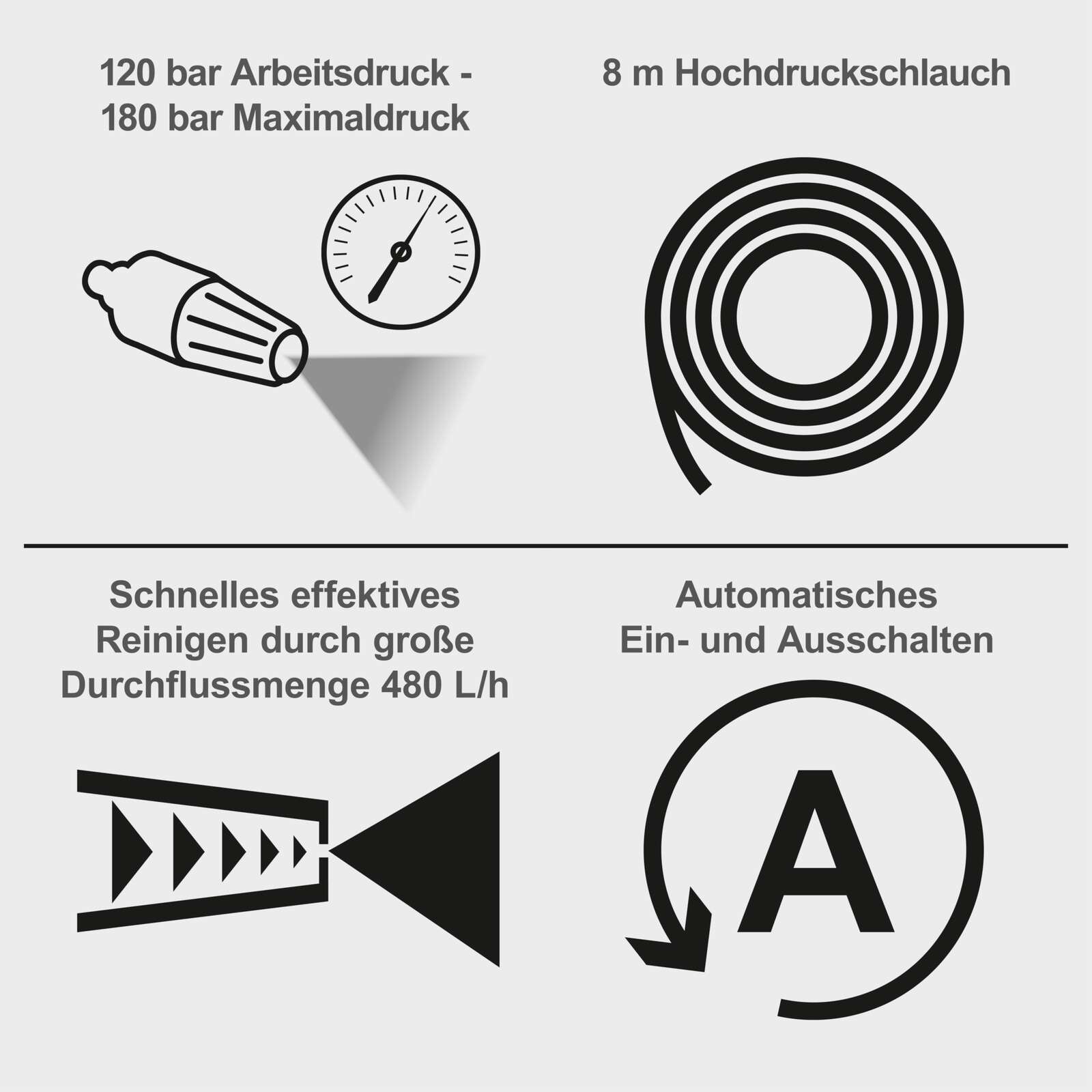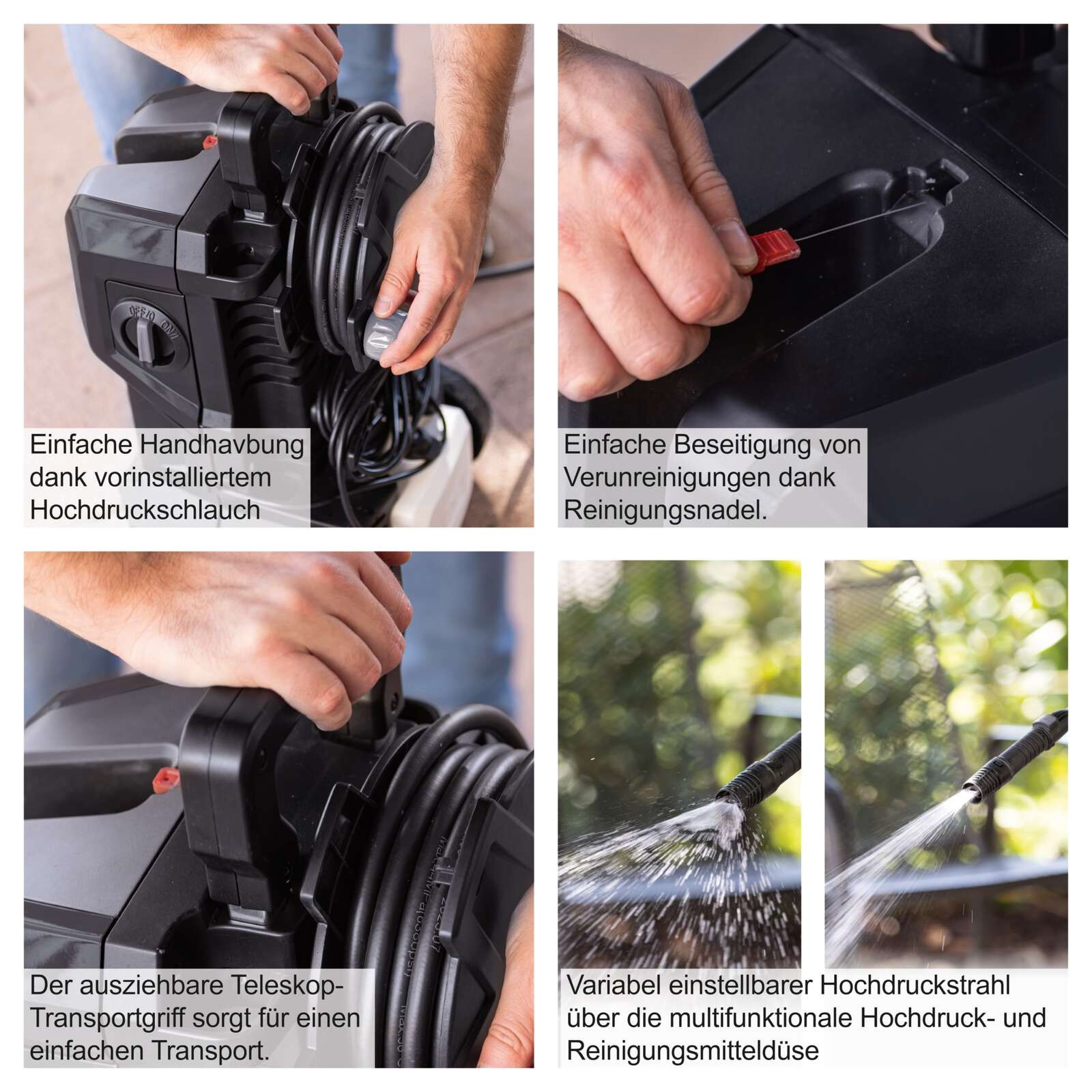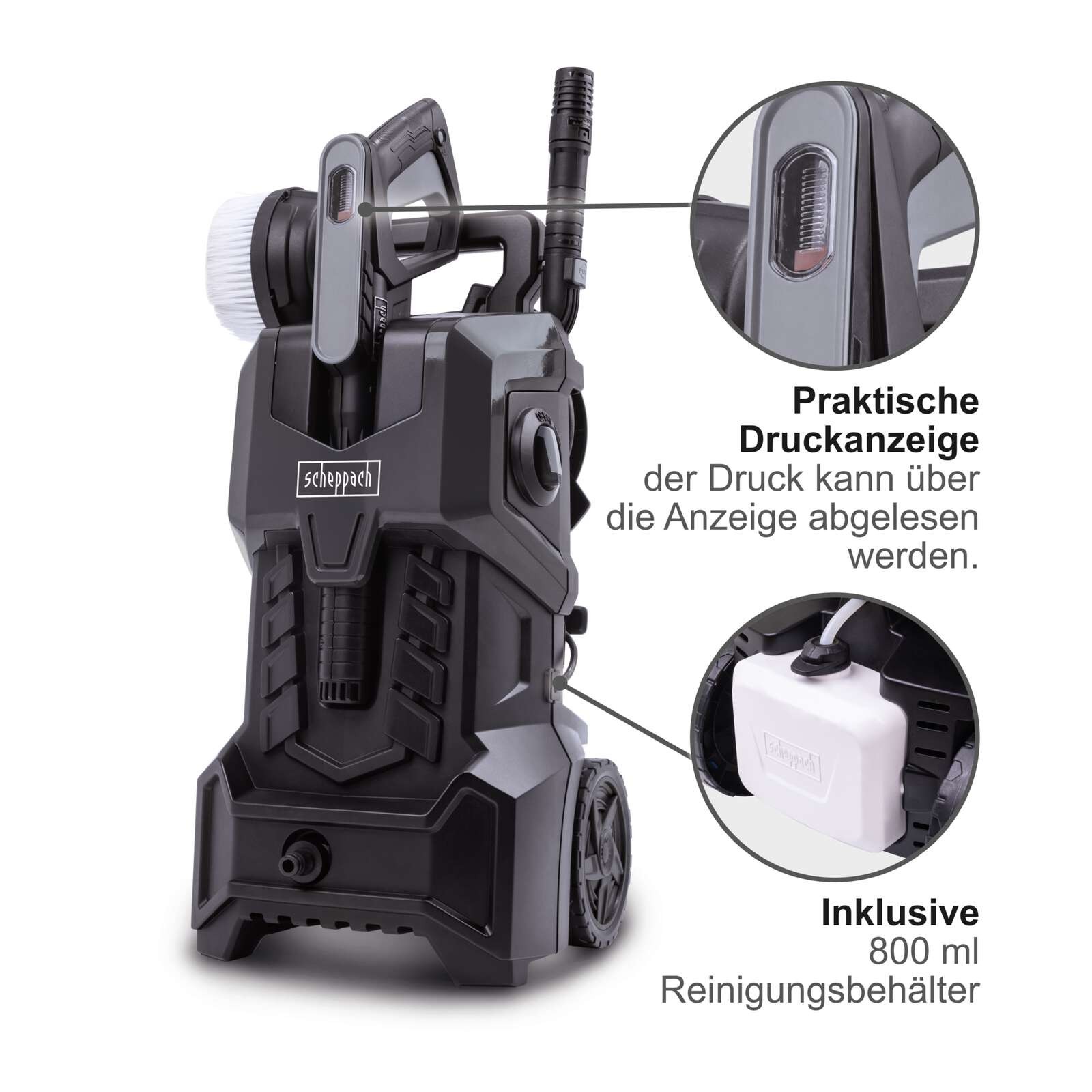 Водоструйката Scheppach HPC2400-BE е идеален помощник за почистване около дома, в двора или на строителната площадка. Мощният 2400 W електромотор създава максимално налягане до 180 bar, което позволява лесно премахване на упорити замърсявания, мъх, водорасли и кал от алеи, дворове, тераси, автомобили и градински мебели. Налягането на струята може да се регулира чрез многофункционалната дюза за високо налягане и препарат, а текущото работно налягане се показва директно на накрайника със спусък. Системата за автоматично включване и изключване на мотора намалява разхода на вода и електроенергия.